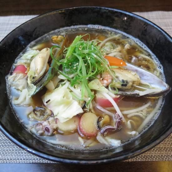 Chicken broth with wavy noodles, our original soy sauce green mussel, mixed seafood, cabbage, carrots, bean sprouts, sesame seeds, green onion and fried onion
