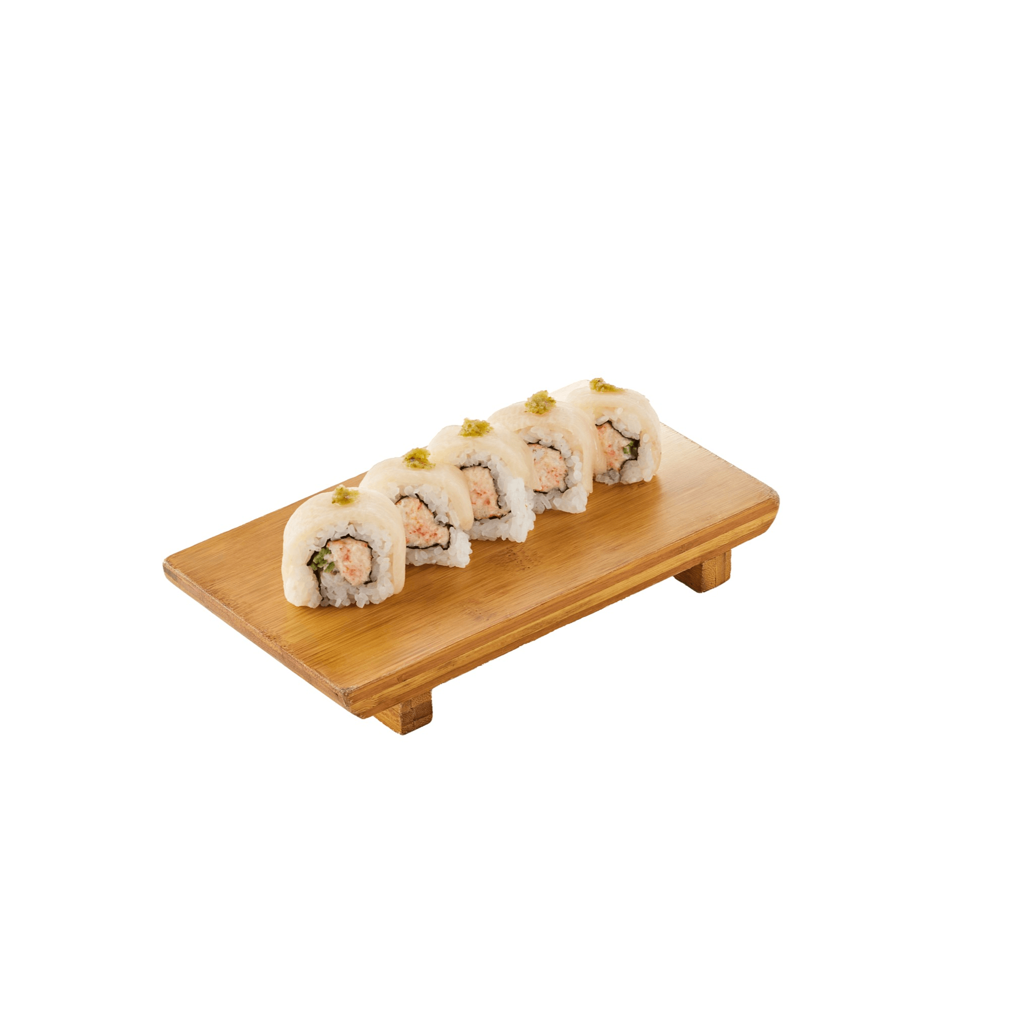 Crabmeat wrapped with salmon, tobbiko and avocado with genovese