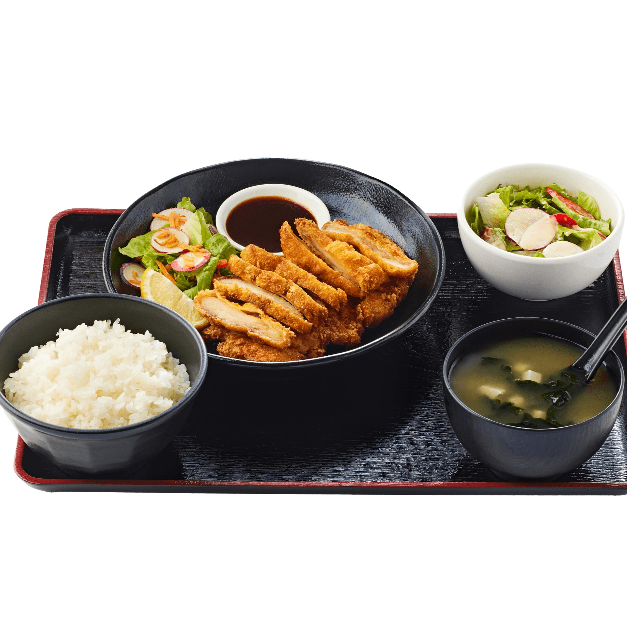 Deep-fried breaded chicken thigh meat with tonkatsu sauce. Comes with miso soup, rice, mini salad