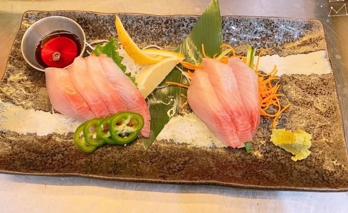 Yellowtail sashimi with genovese, jalapeno, sriracha, kaiware sprout, ponzu, garlic chili oil