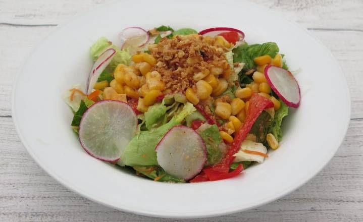 Lettuce, shredded radish, red radish, carrots, bell pepper, kaiware sprout, corn, fried onion, and sesame seeds. Comes with ginger dressing