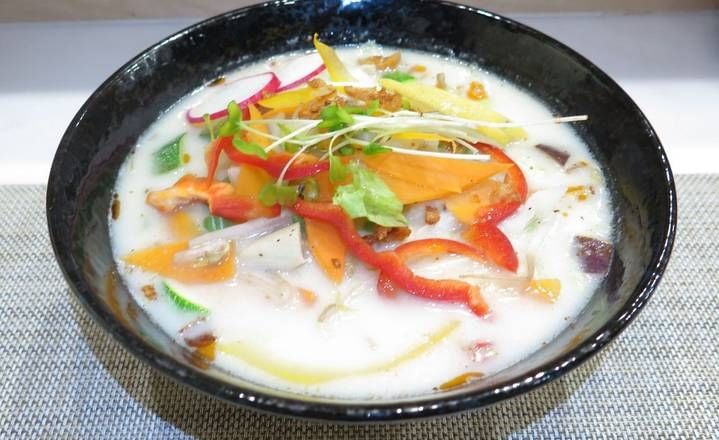 Pork broth with gluten free noodles, creamy based sauce with olive oil, sliced fried chicken, menma, mushroom, green onions, and sesame seeds