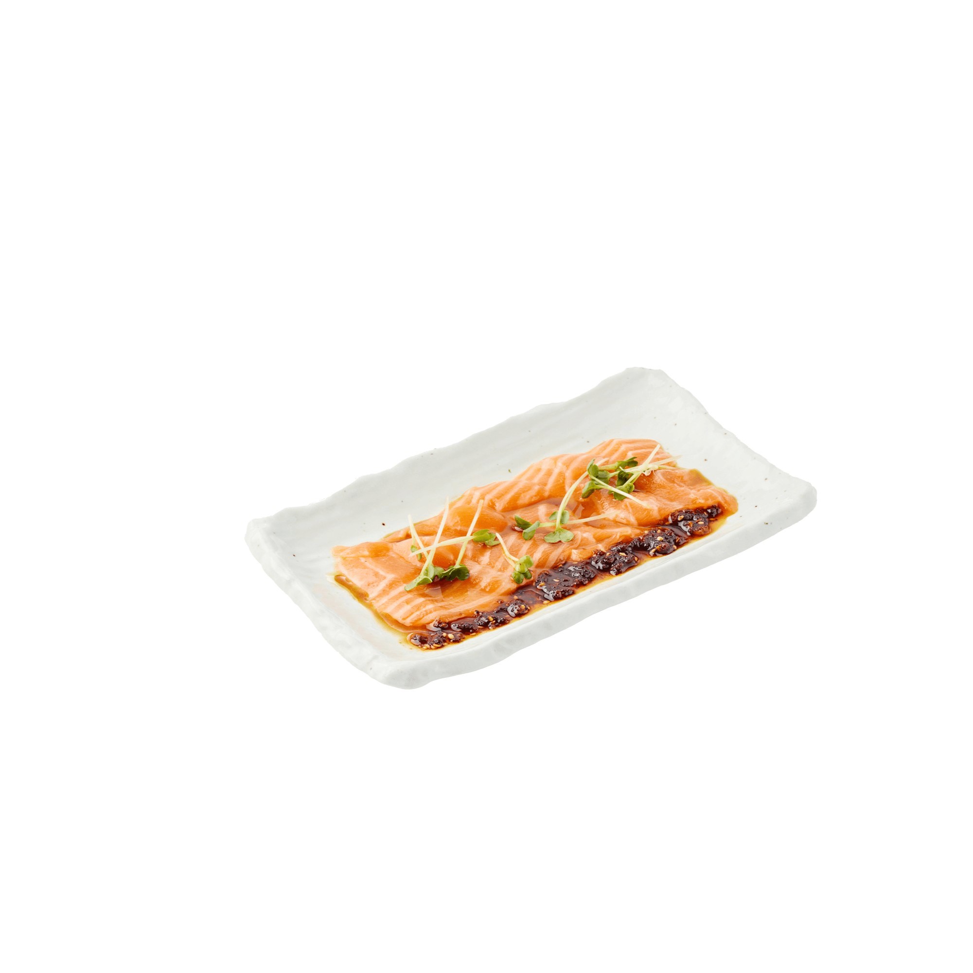Otoro salmon sashimi with soy sauce and garlic chili oil, genovese, kaiware sprout
