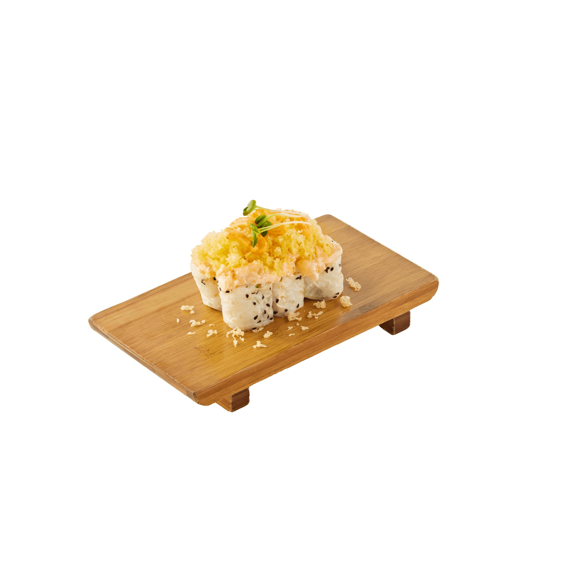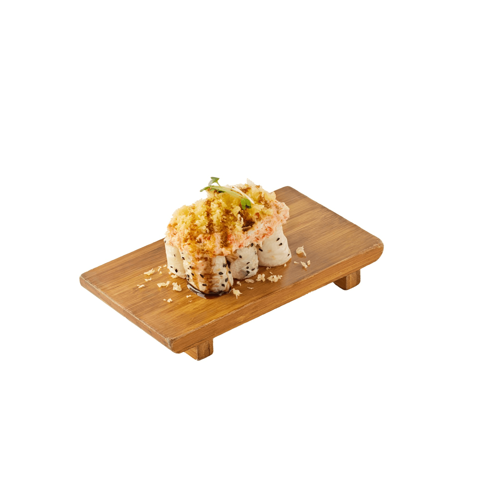6 pieces. California wrapped with soy paper with crab meat, tempura flakes, teriyaki sauce, kaiware sprout