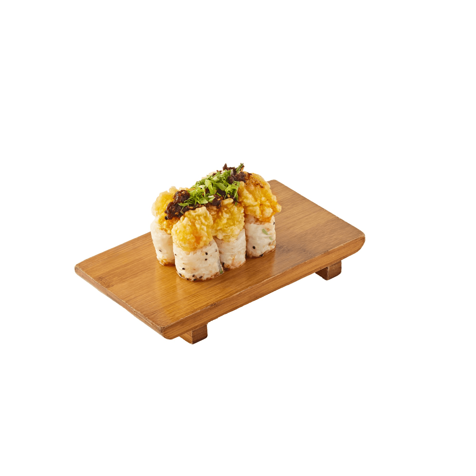 6 pieces. California wrapped with soy paper with popcorn shrimp with garlic chili oil, scallions