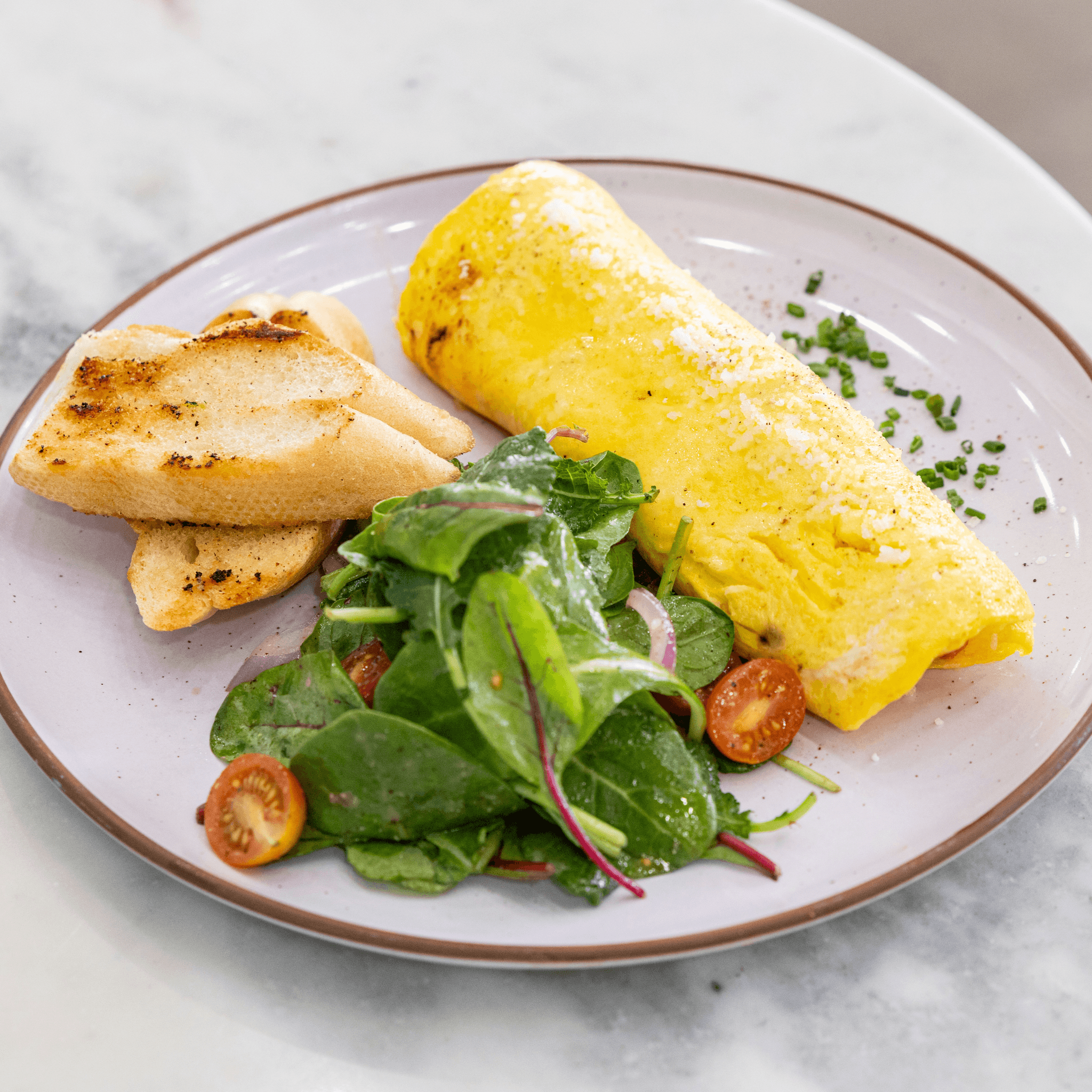 Fluffy omelette with a rich blend of emmental, gruyere and pecorino romano cheese, hickory smoked ham, served with house salad and fresh baguette