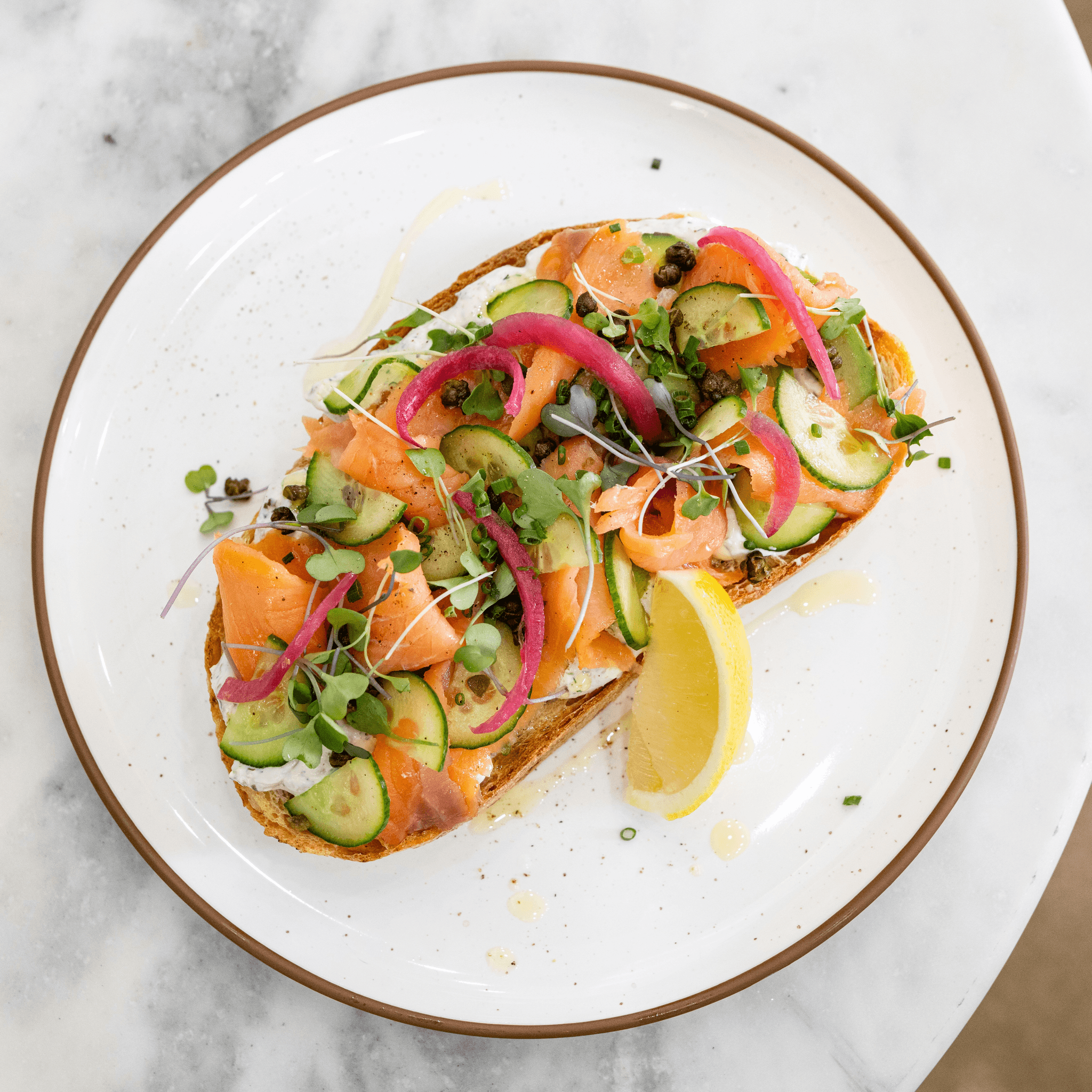 Atlantic smoked salmon, avocado, herbed cream cheese with capers, Persian cucumbers, pickled onions, fresh herbs on toasted sourdough