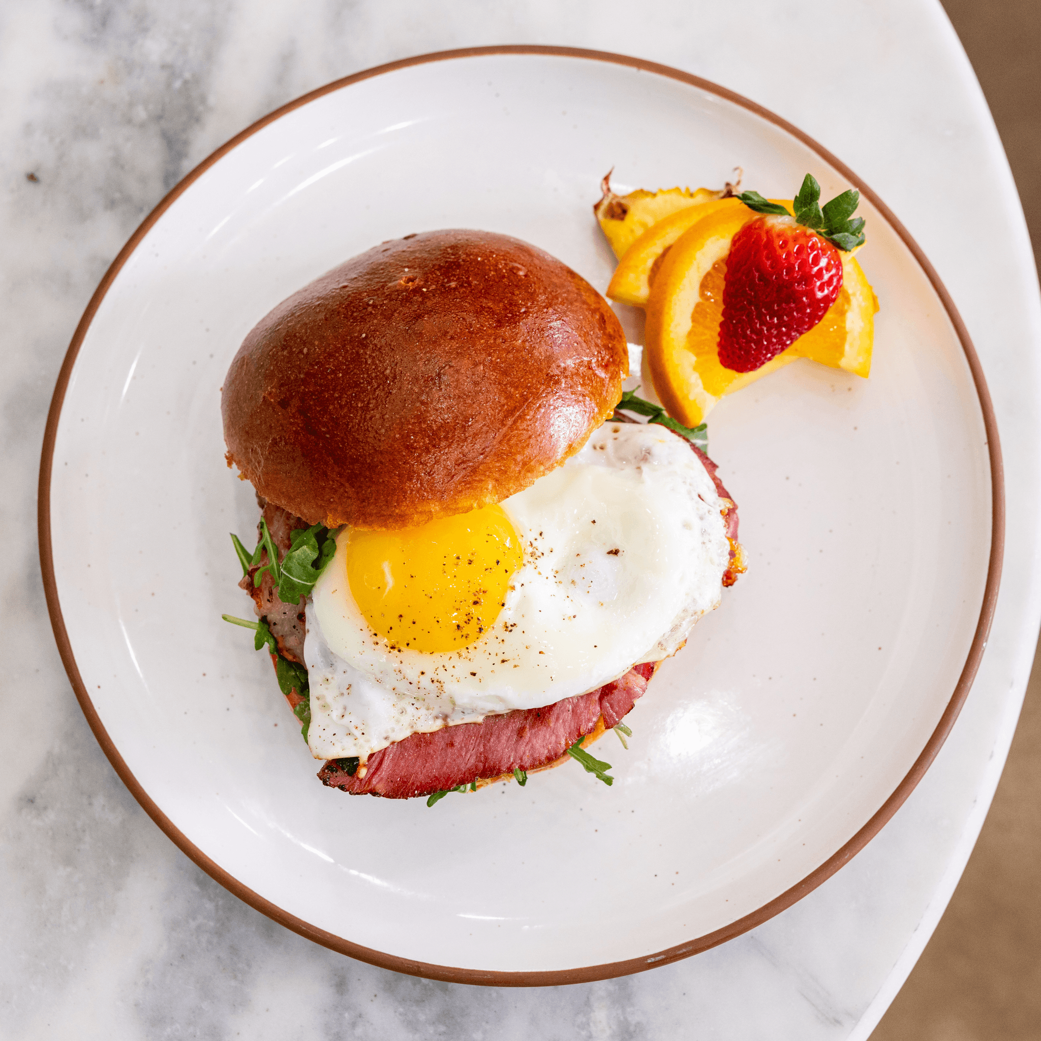 Fried egg, hickory smoked steak ham, swiss cheese, heirloom tomatoes, avocado and arugula, drizzled with chipotle aioli on a buttery brioche bun, served with a side of seasonal fruit