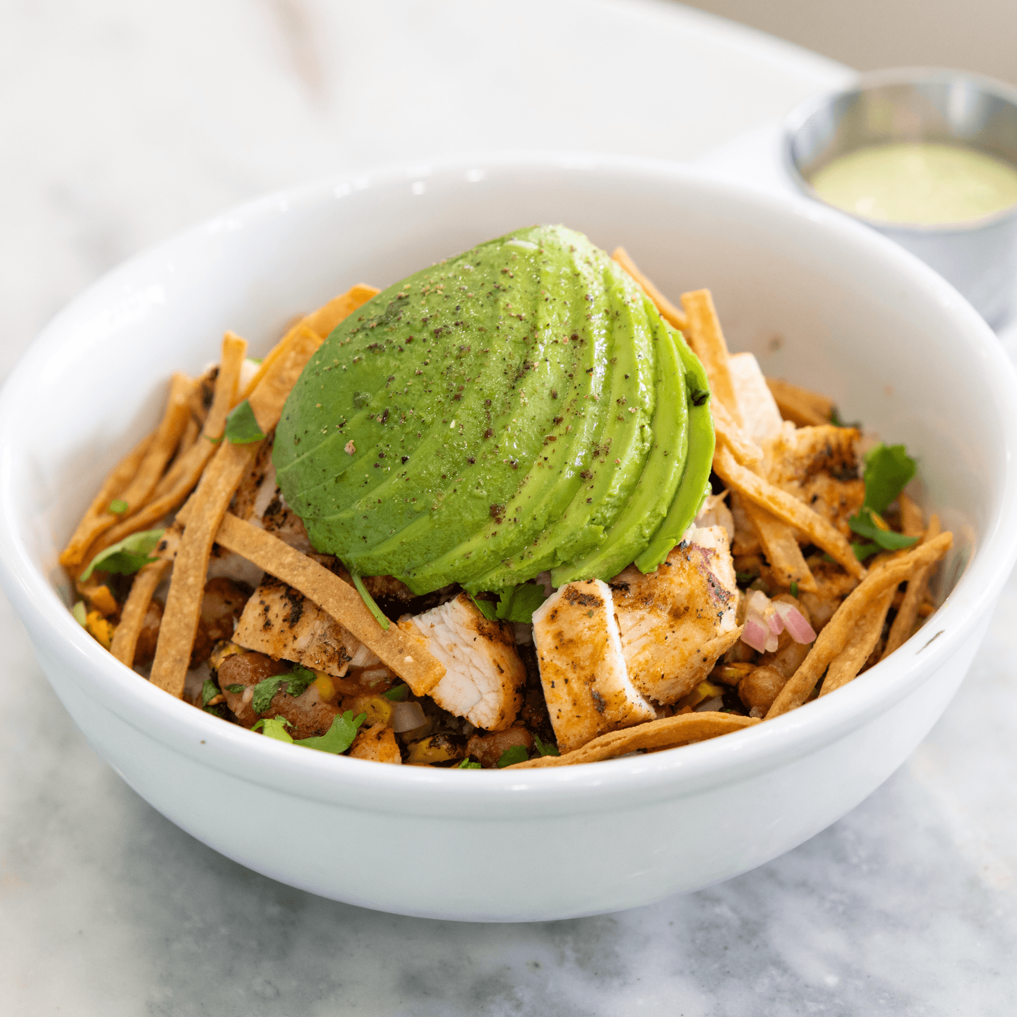 Grilled chicken breast, rice mix with Peruvian beans and grilled corn; avocado, cheddar, pico de gallo, tortilla strips, cilantro aioli
