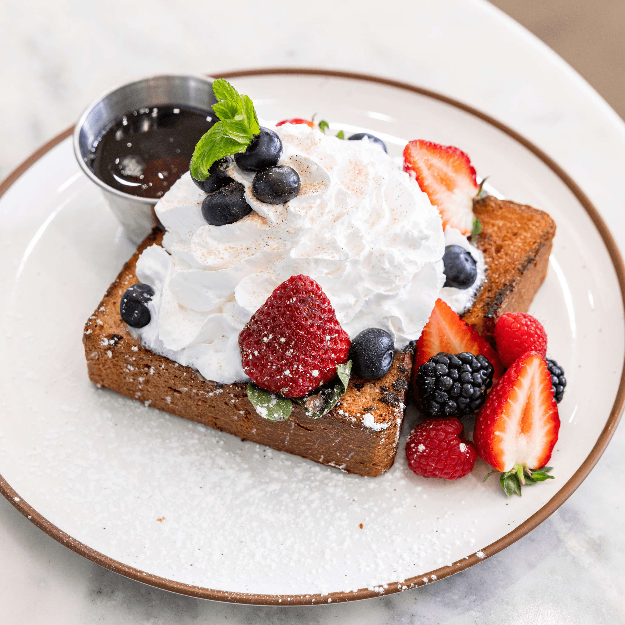 Thick slice of brioche, fresh berries, home-made whipped cream, pure maple syrup