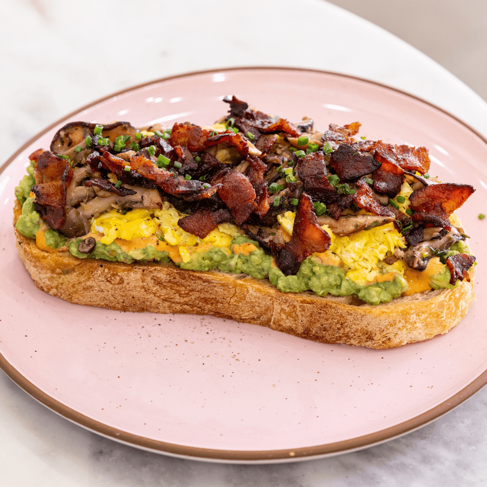 Scrambled eggs, smashed avocado, wild sautéed mushrooms, bacon bits, chipotle aioli on toasted sourdough