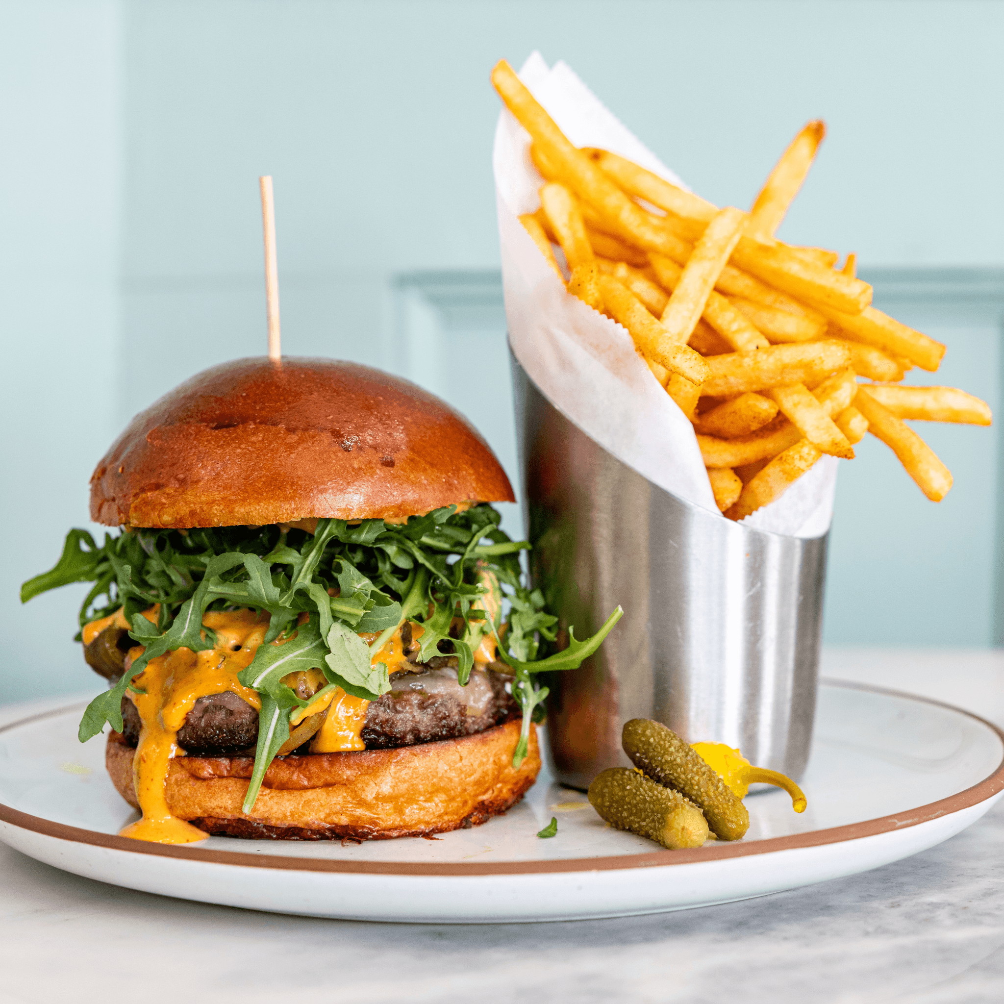 Beef patty, poblano rajas, pepper jack cheese, avocado, baby arugula, chipotle aioli on a buttery brioche bun