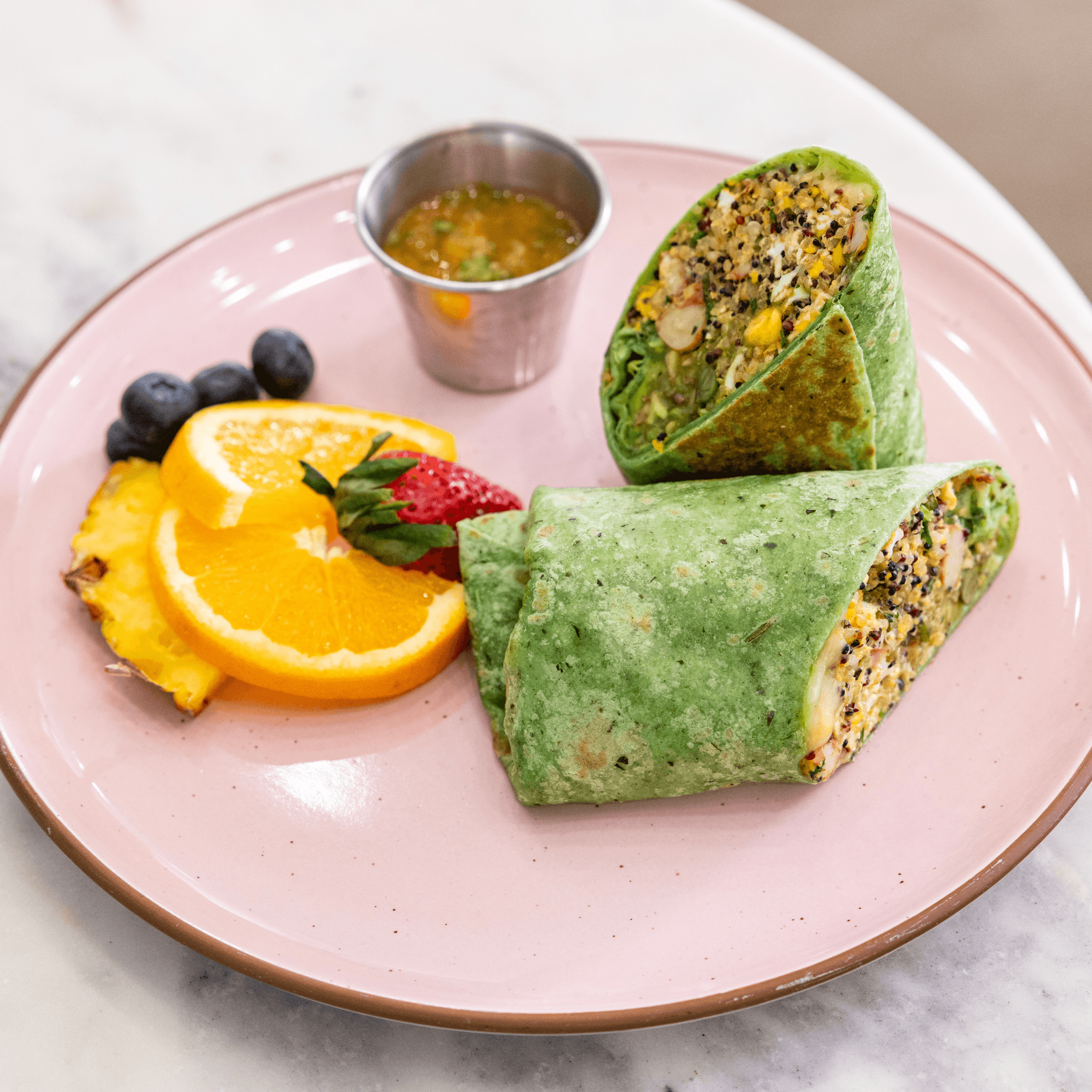 Scrambled eggs, avocado, mozzarella, rainbow quinoa mix with peruvian and black beans, cilantro, roasted corn and salsa; spinach tortilla