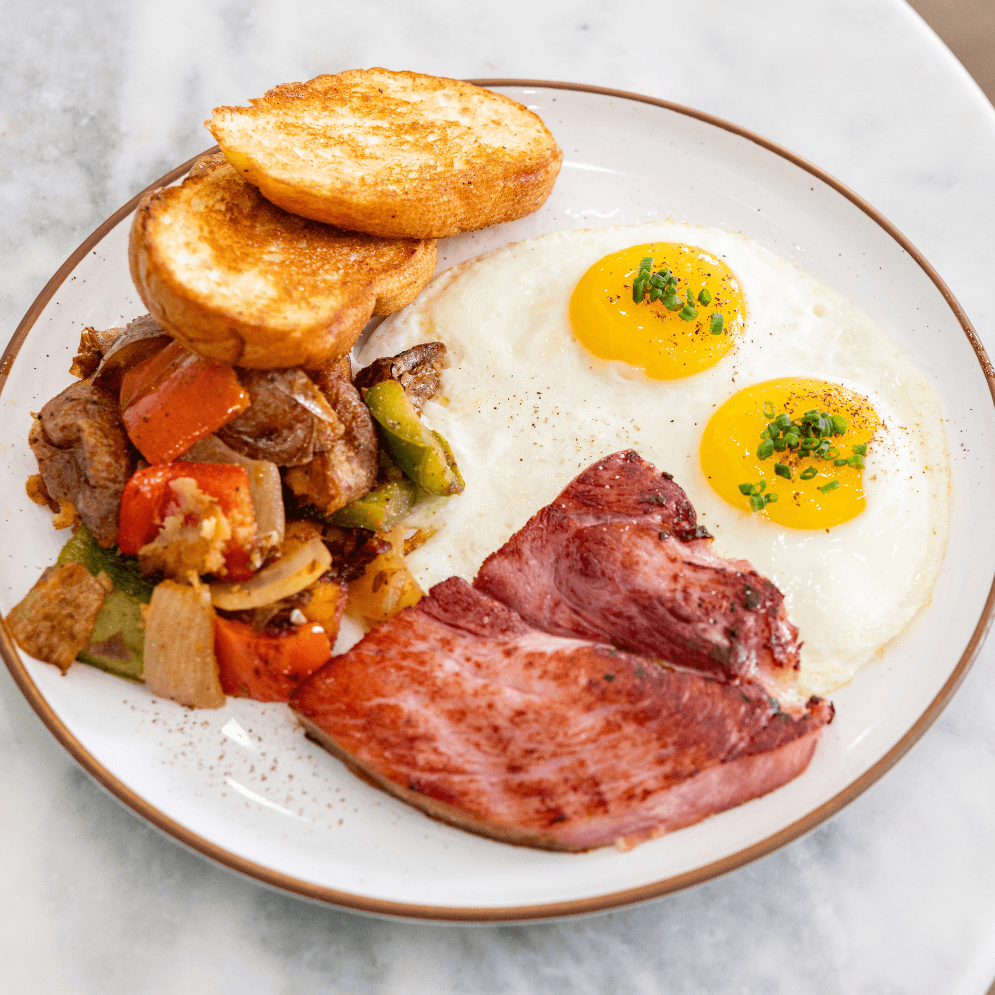 Two sunny side up eggs, hickory smoked steak ham, breakfast potatoes with bell peppers and onions, served with fresh baguette