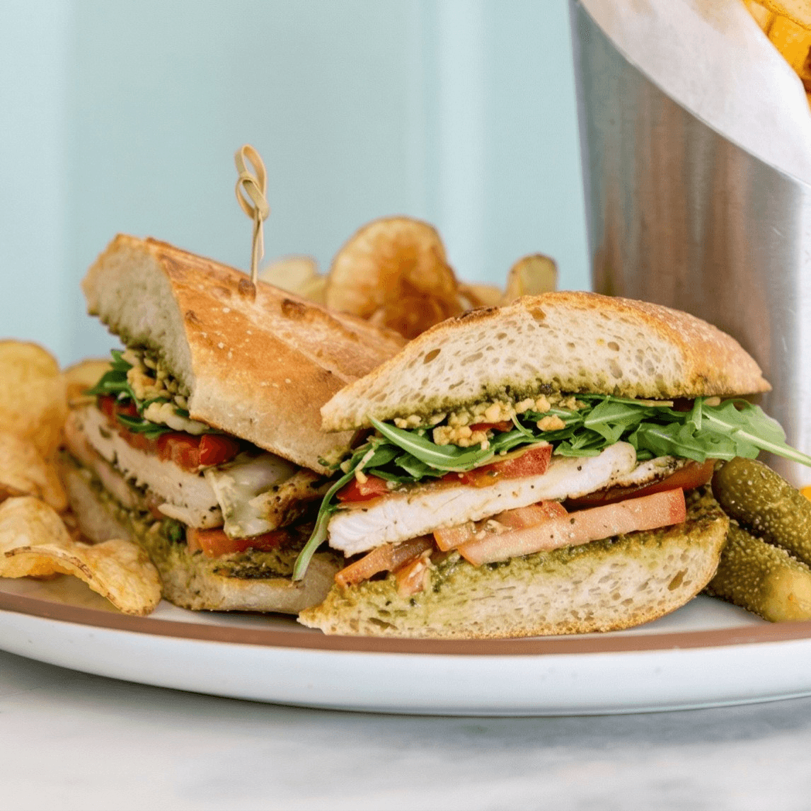 Grilled chicken breast, tomato, provolone, roasted red pepper, basil pesto, parmesan crisp, French roll, house chips. Served with house chips