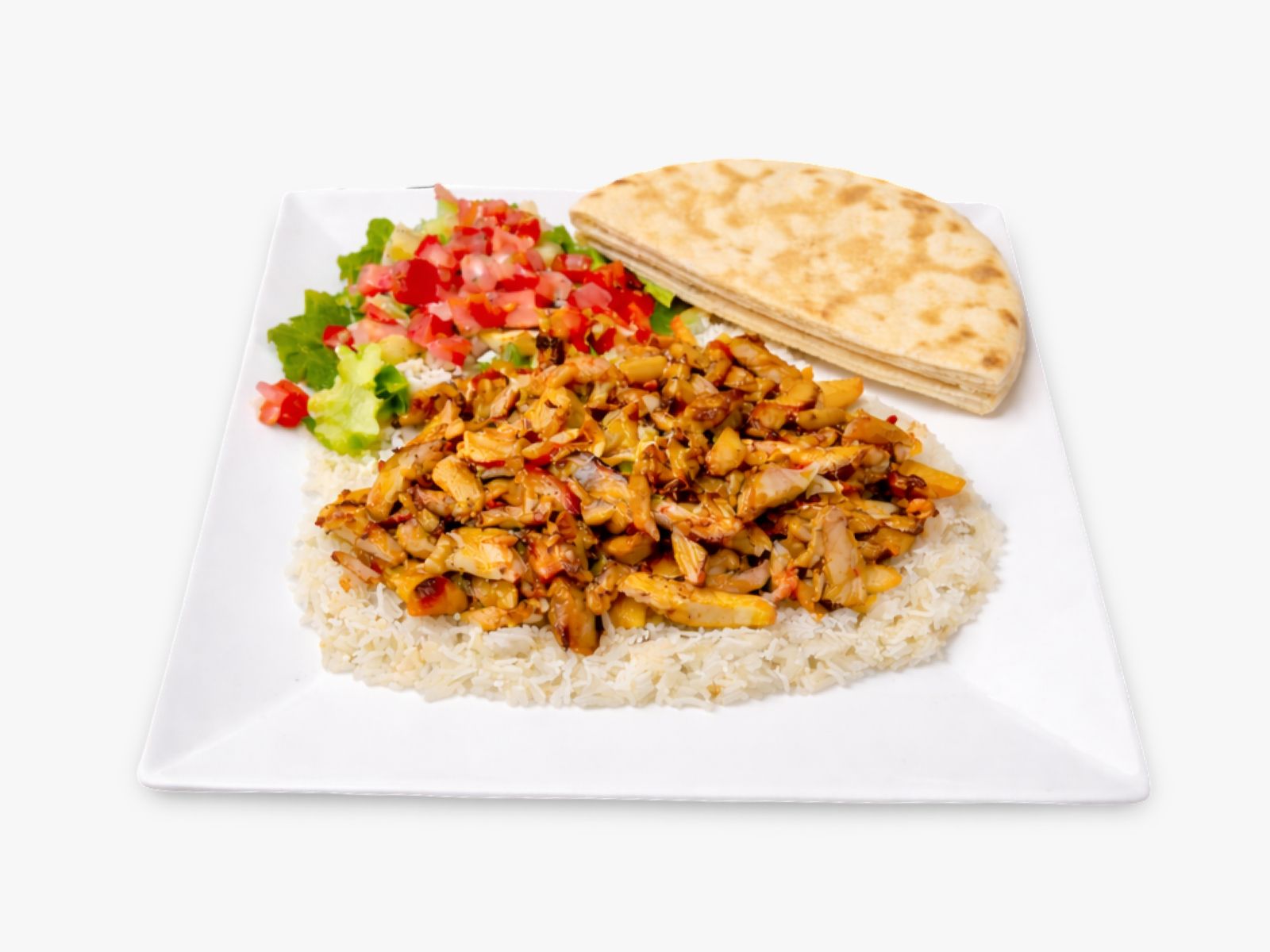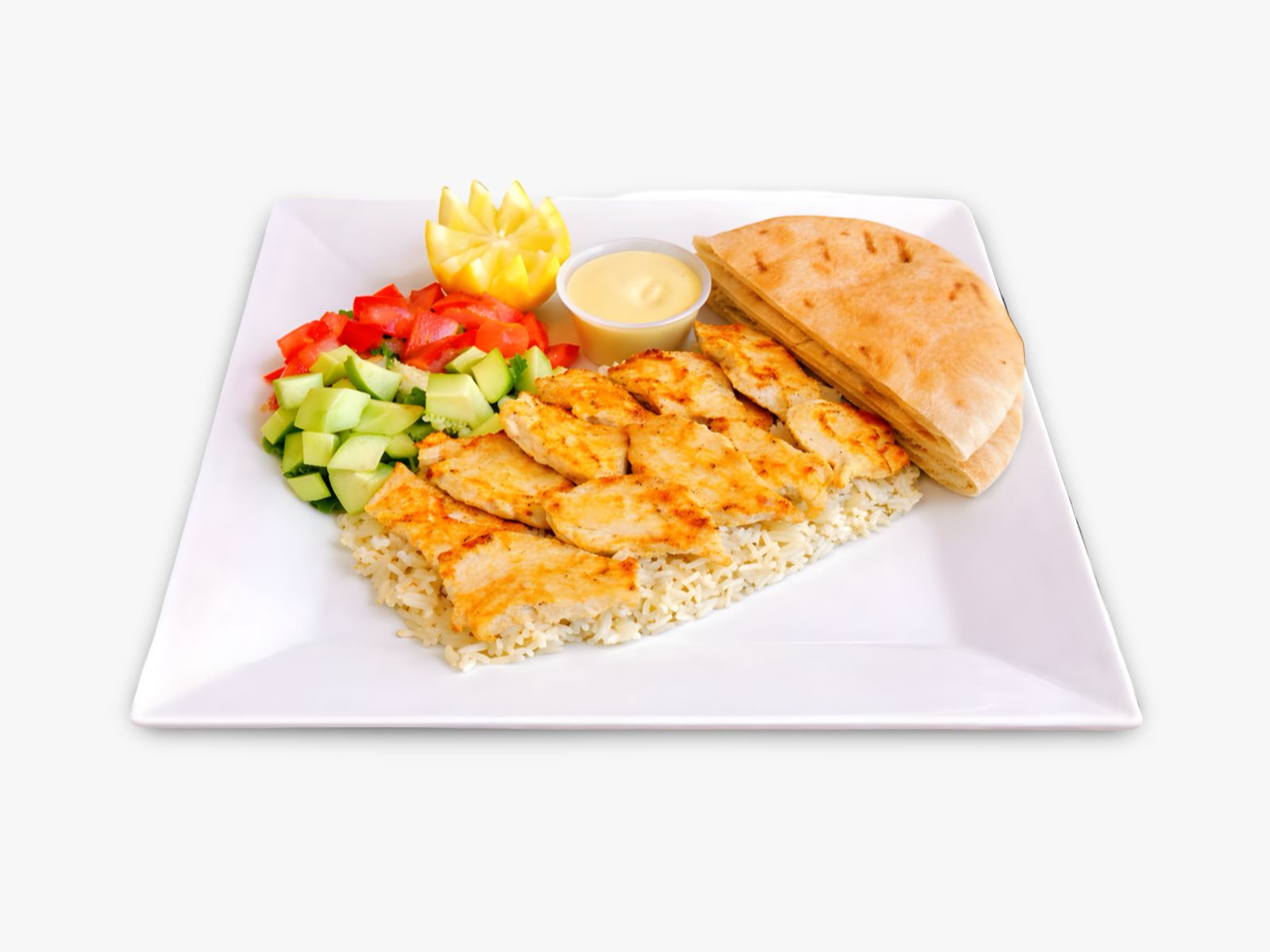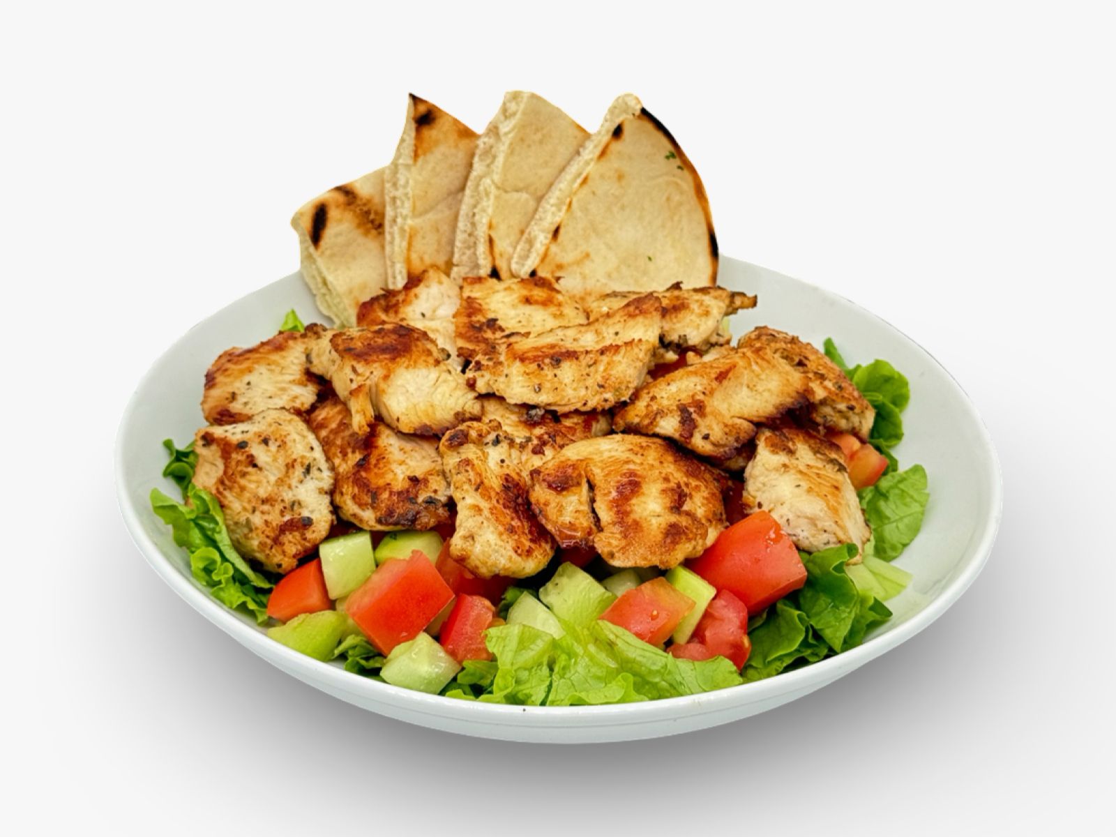 Tender grilled chicken served over fresh lettuce, tomato, and cucumber, with our special sauce and house dressing on the side, plus warm pita bread.