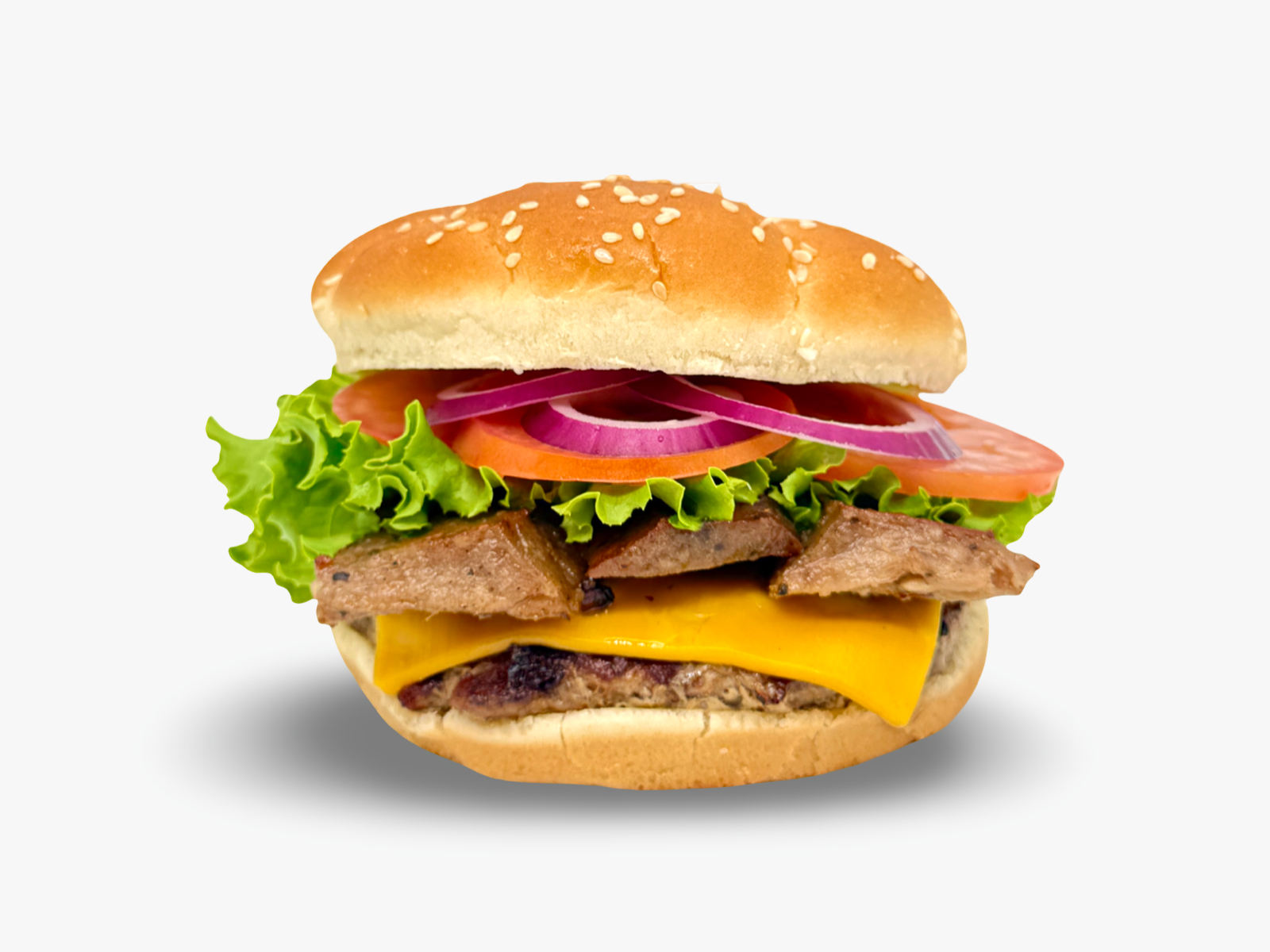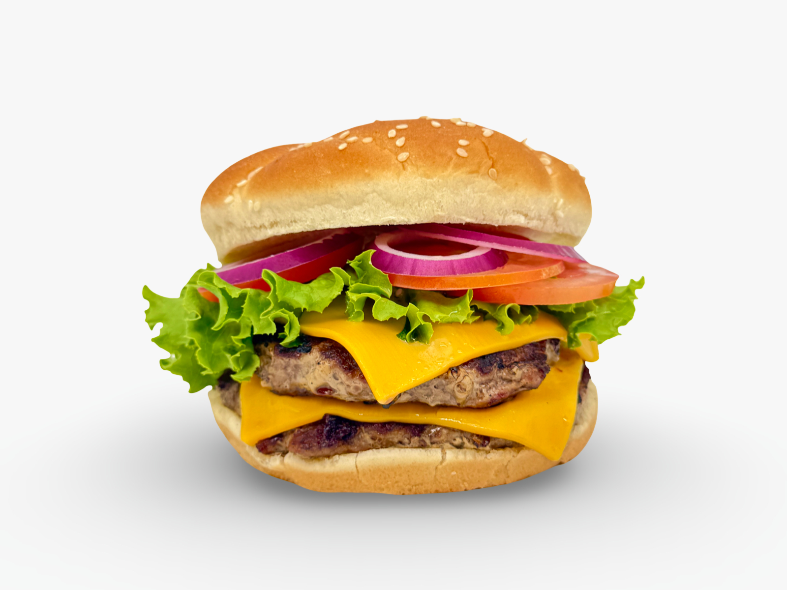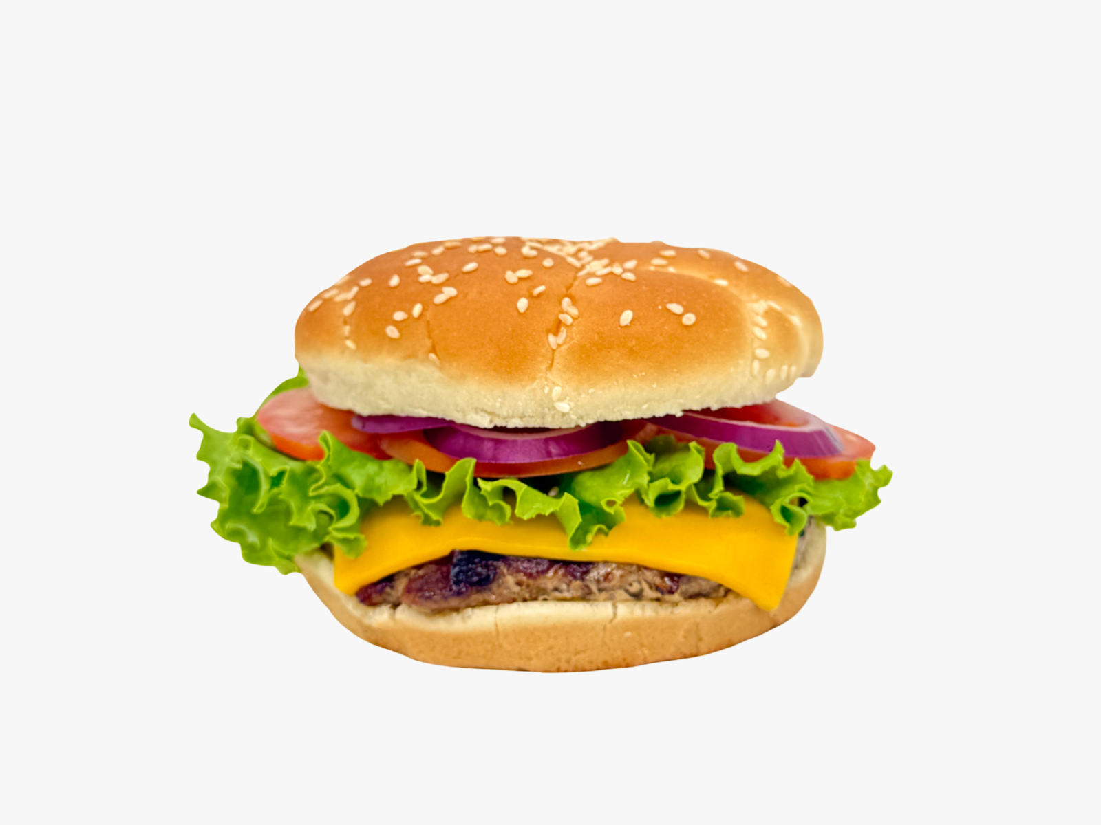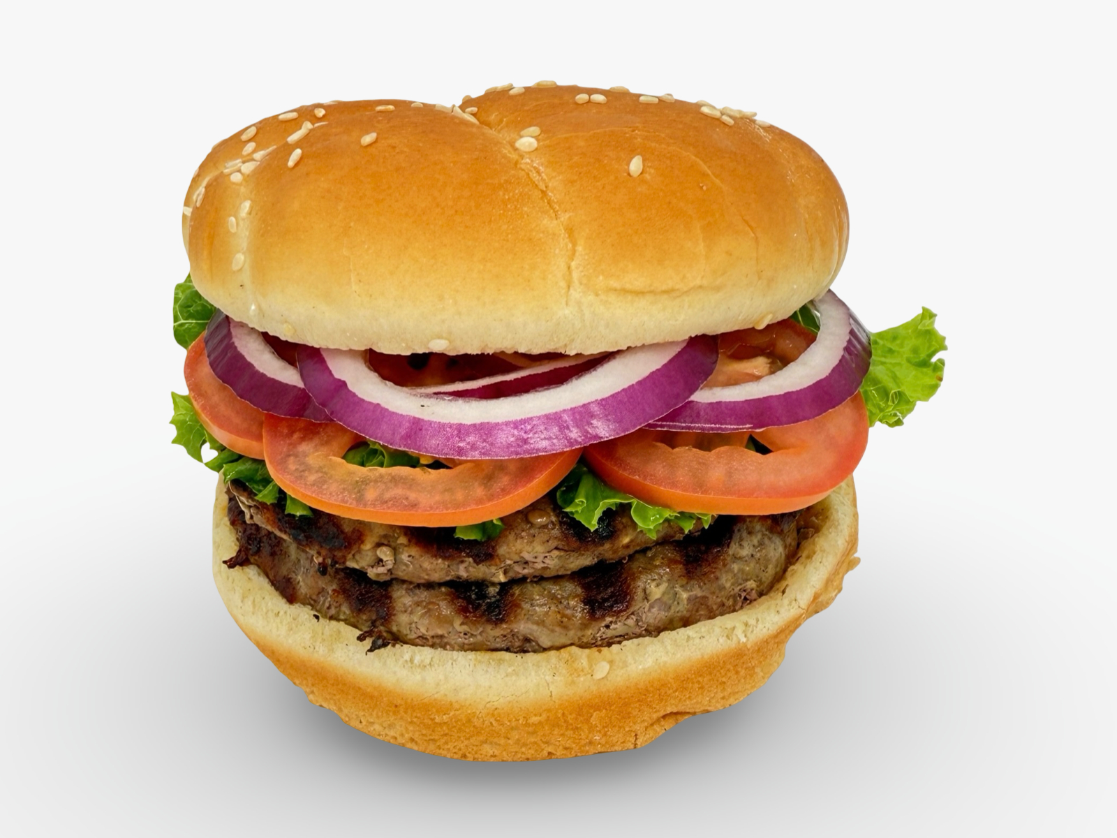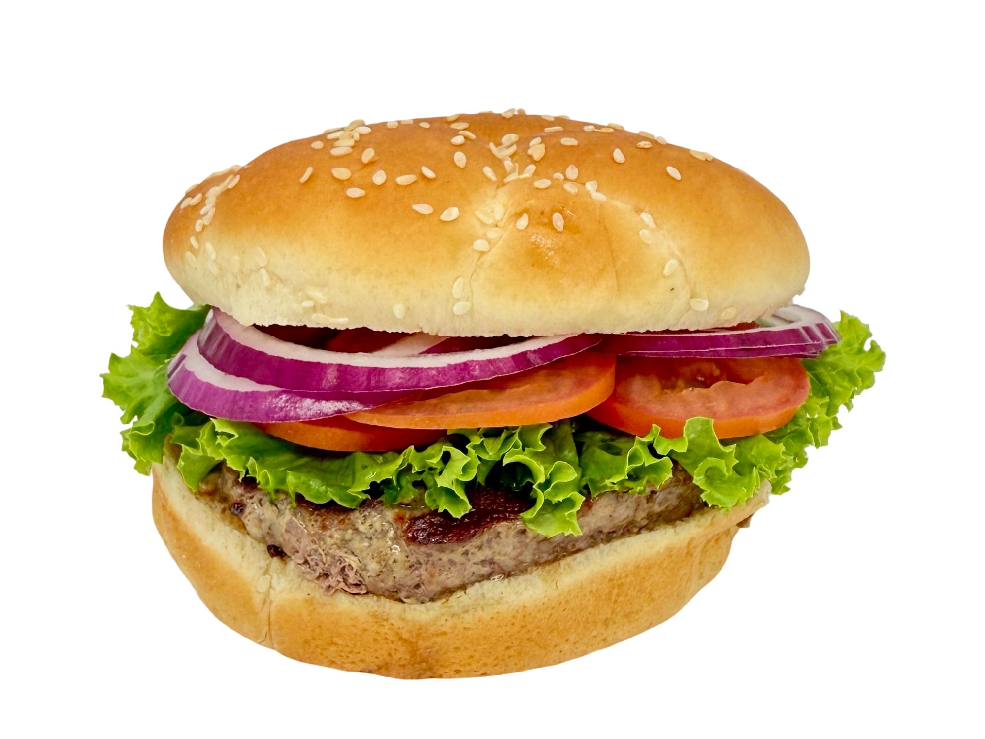 Juicy charbroiled beef patty on a sesame bun with ketchup, mayo, crisp lettuce, fresh tomato, and onion for a classic, satisfying bite.