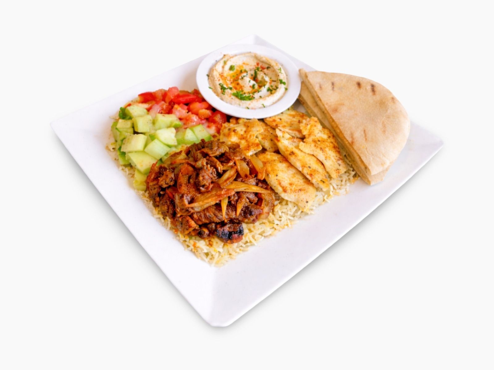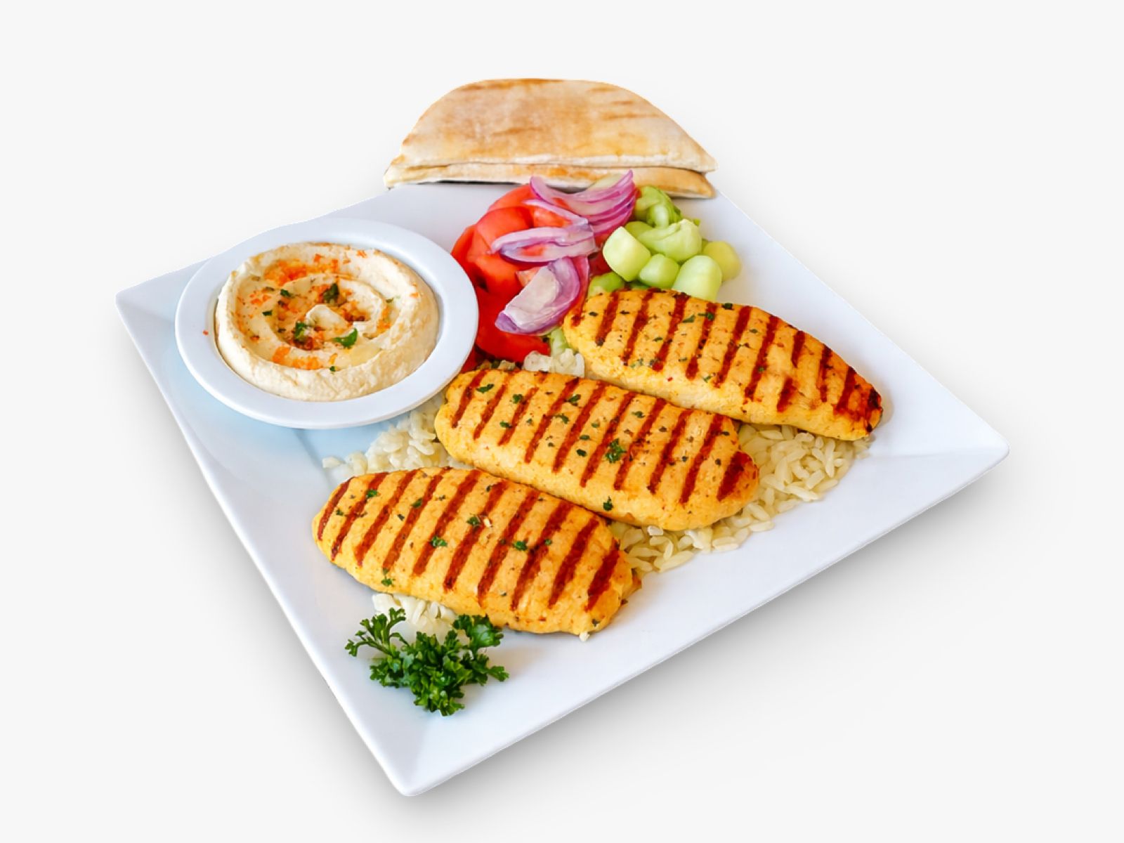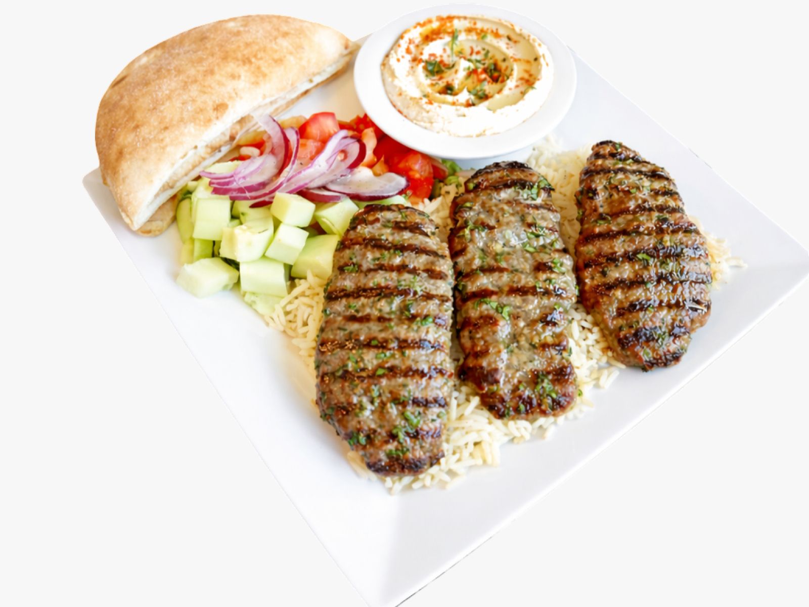 Seasoned ground beef charbroiled to perfection, served with creamy hummus, warm pita bread, fresh salad, and your choice of rice, brown rice, or fries