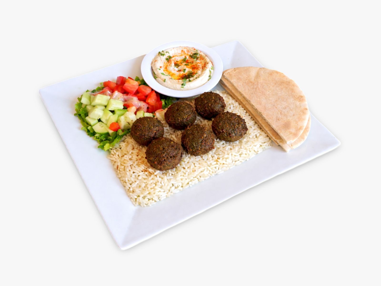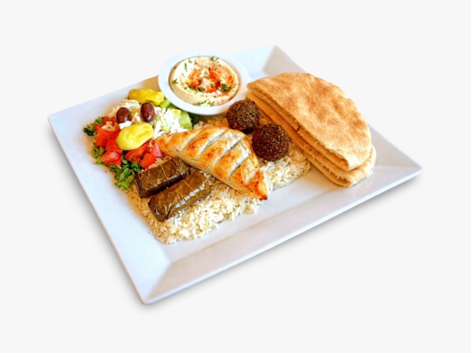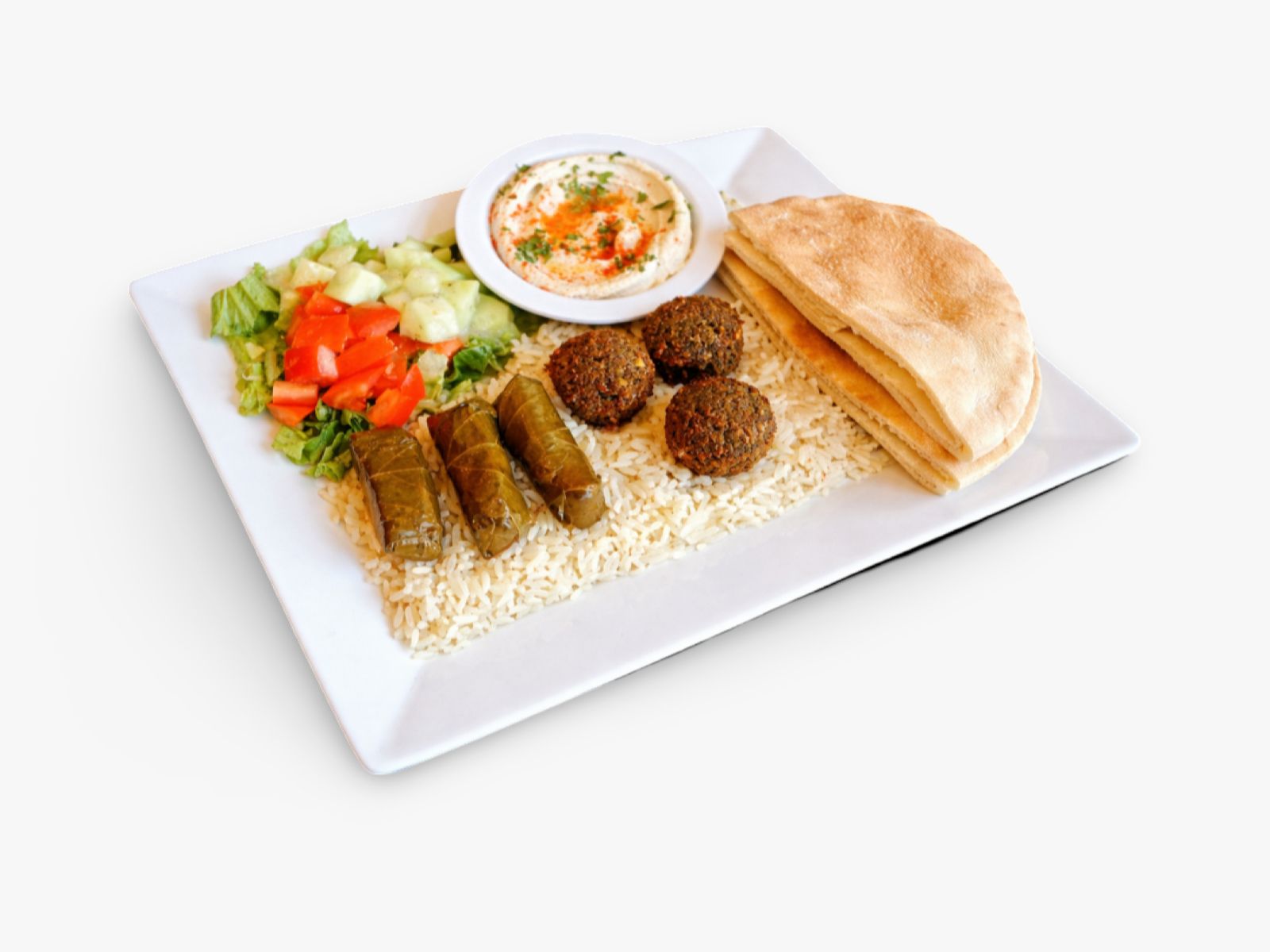 Falafel, creamy hummus, dolma, warm pita bread, tahini sauce, fresh salad, and your choice of rice, brown rice, or fries — a perfect mix of Mediterranean flavors.