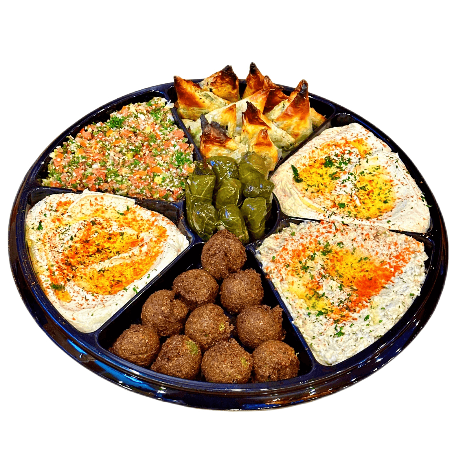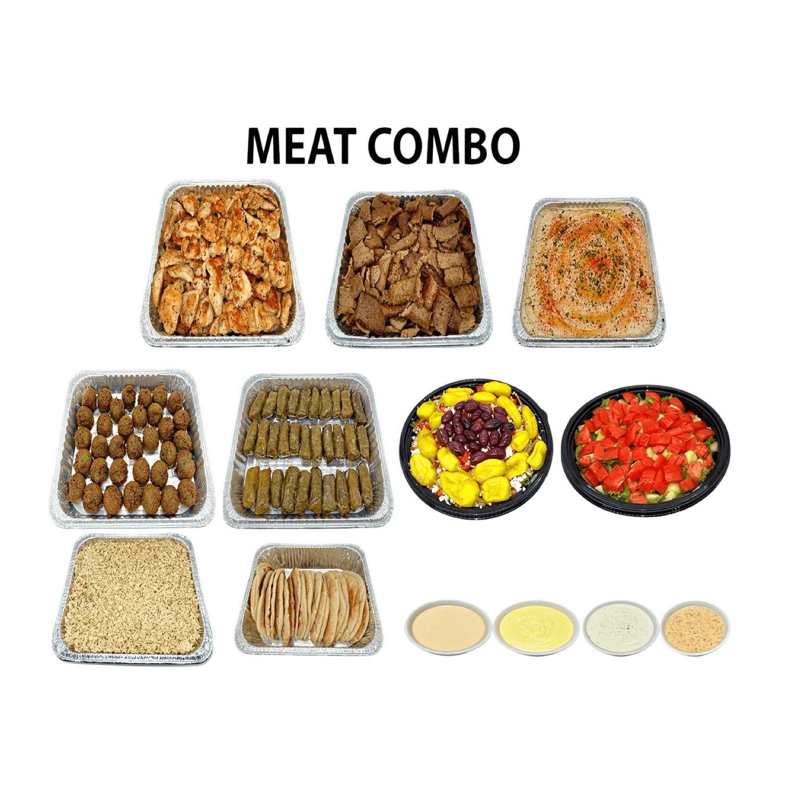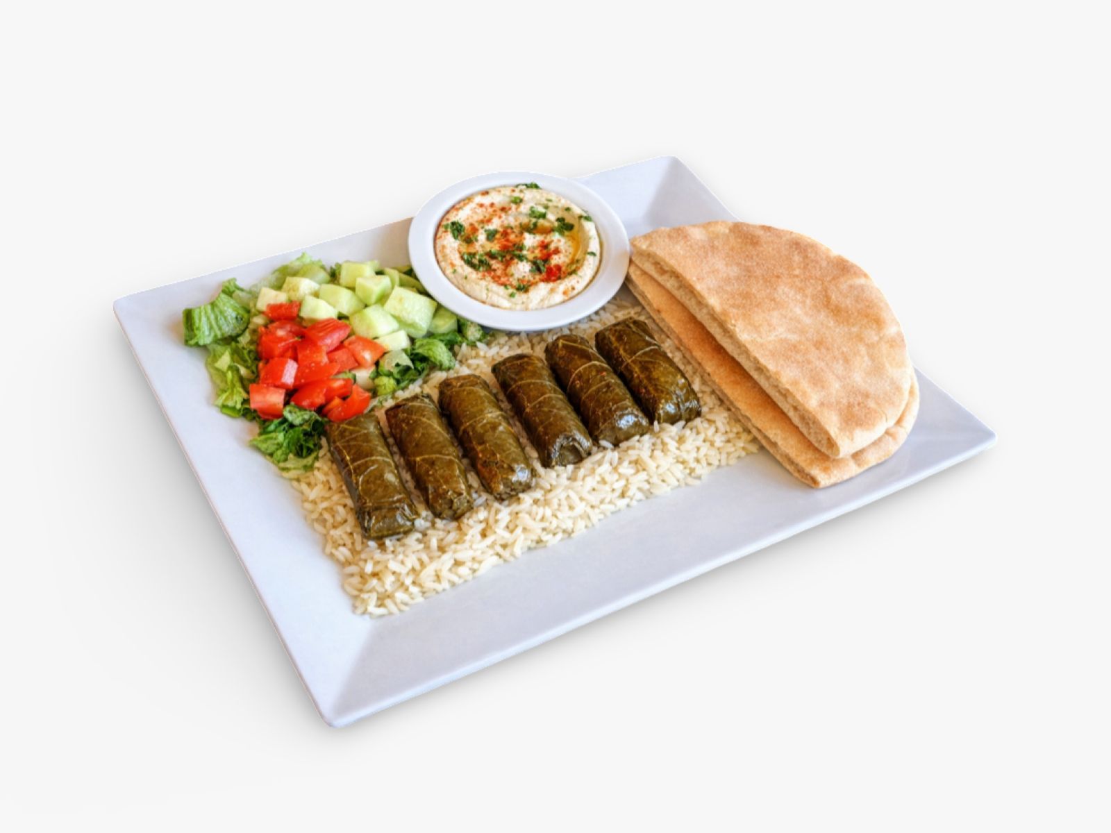 Falafel, creamy hummus, dolma, warm pita bread, tahini sauce, fresh salad, and your choice of rice, brown rice, or fries — a perfect mix of Mediterranean flavors.