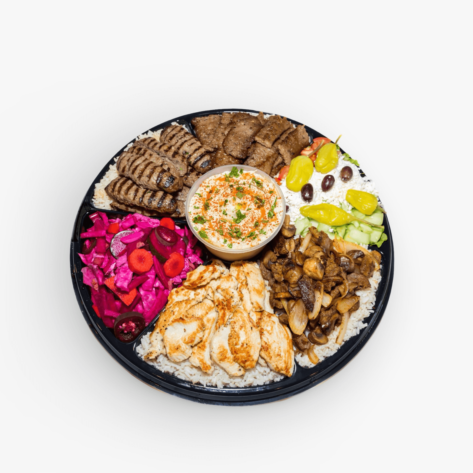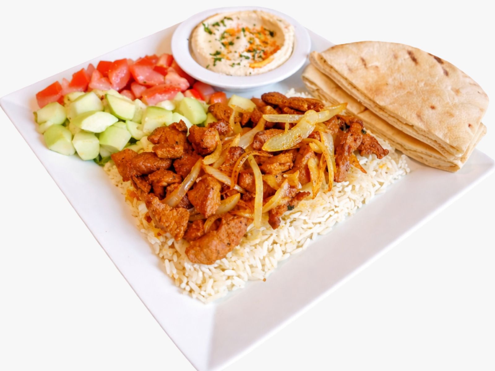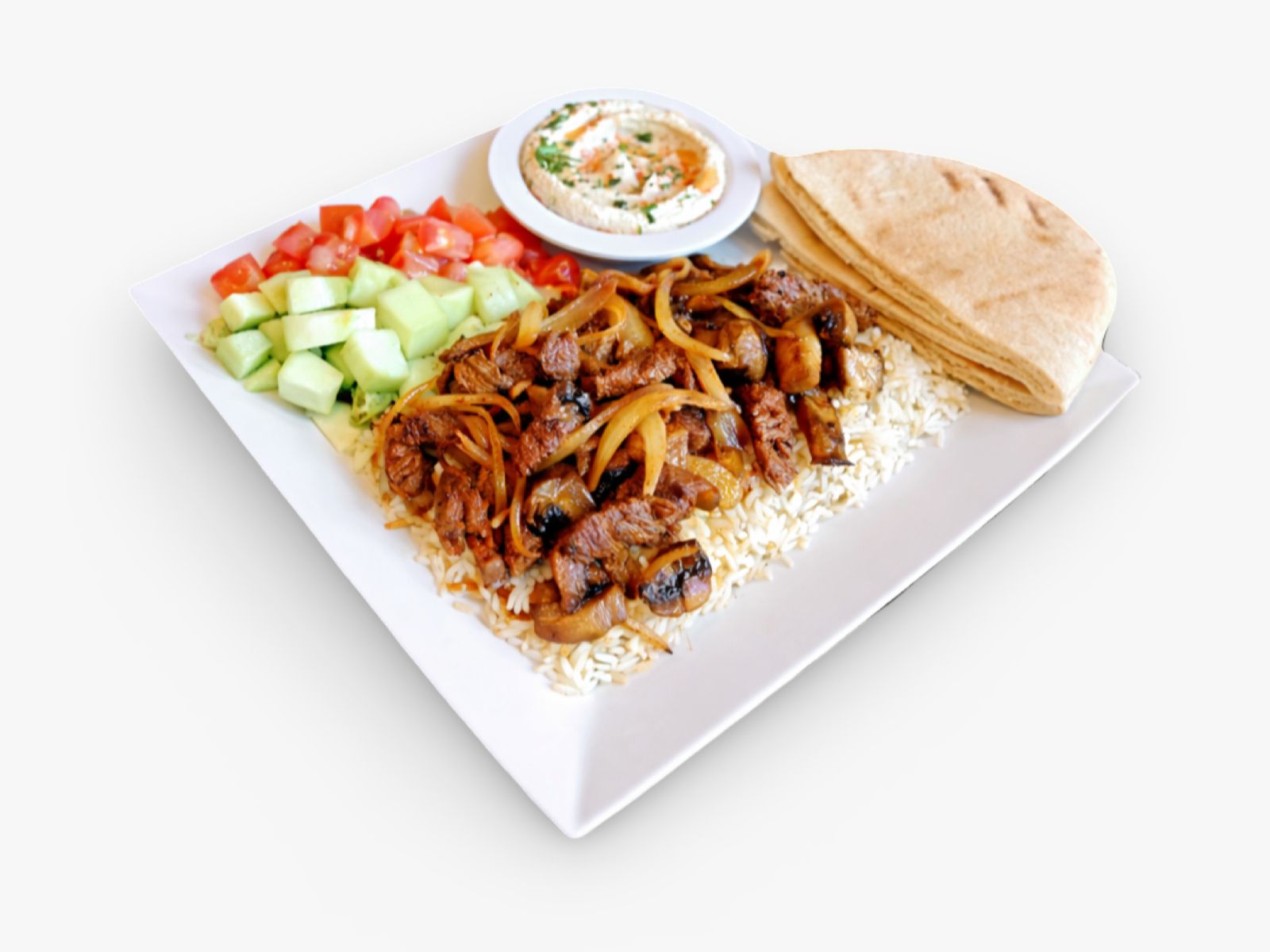 Tender marinated steak with grilled onions and mushrooms, served with creamy hummus, warm pita bread, fresh salad, and your choice of rice, brown rice, or fries.