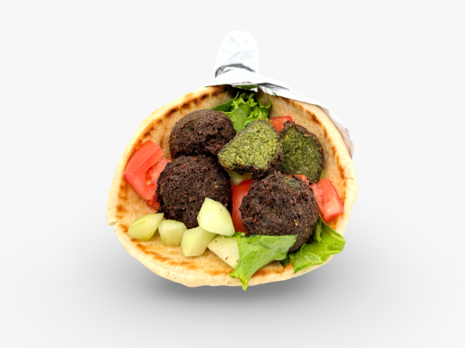 A vegetarian favorite — crispy falafel made from garbanzo beans, vegetables, and spices, served in a warm pita with hummus, tahini sauce, crisp lettuce, fresh tomato, and cucumber for a light, flavorful bite.