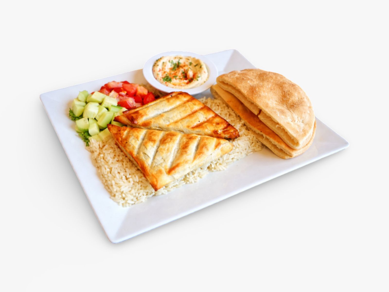 Two pieces baked fresh to order, served with fresh salad, creamy hummus, warm pita bread, tangy yogurt sauce, and your choice of rice, brown rice, or fries.