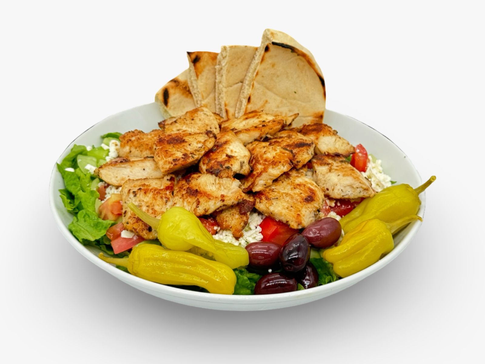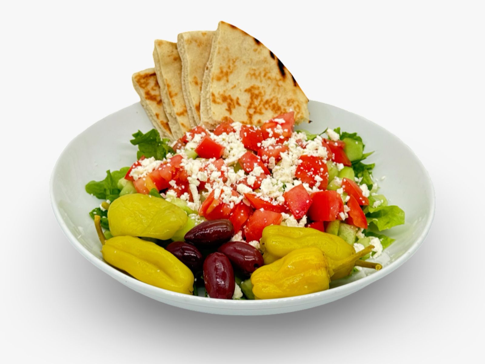 Fresh lettuce, tomato, and cucumber topped with feta cheese, unpitted olives, and pepperoncini, served with our house dressing on the side and warm pita bread.