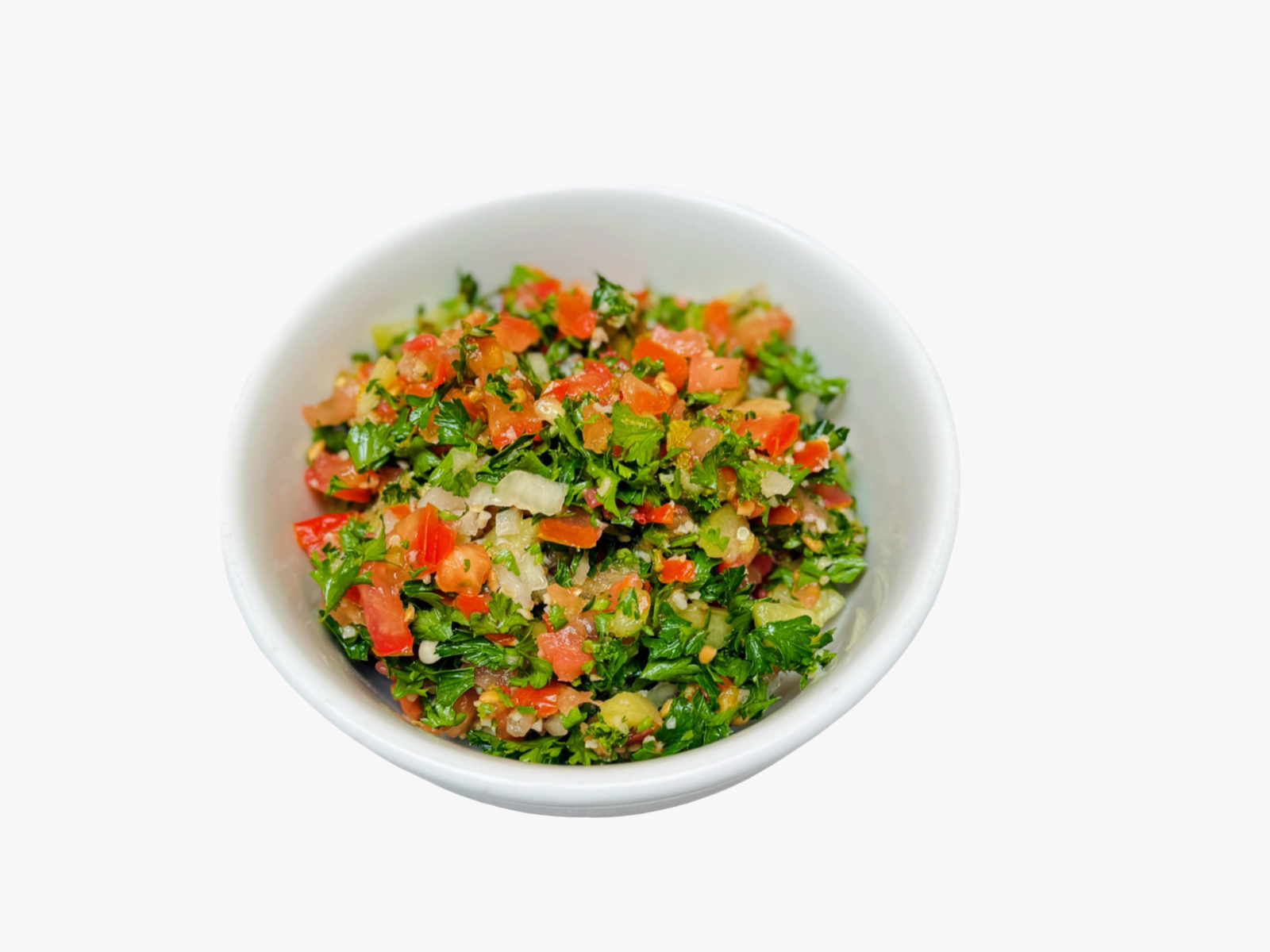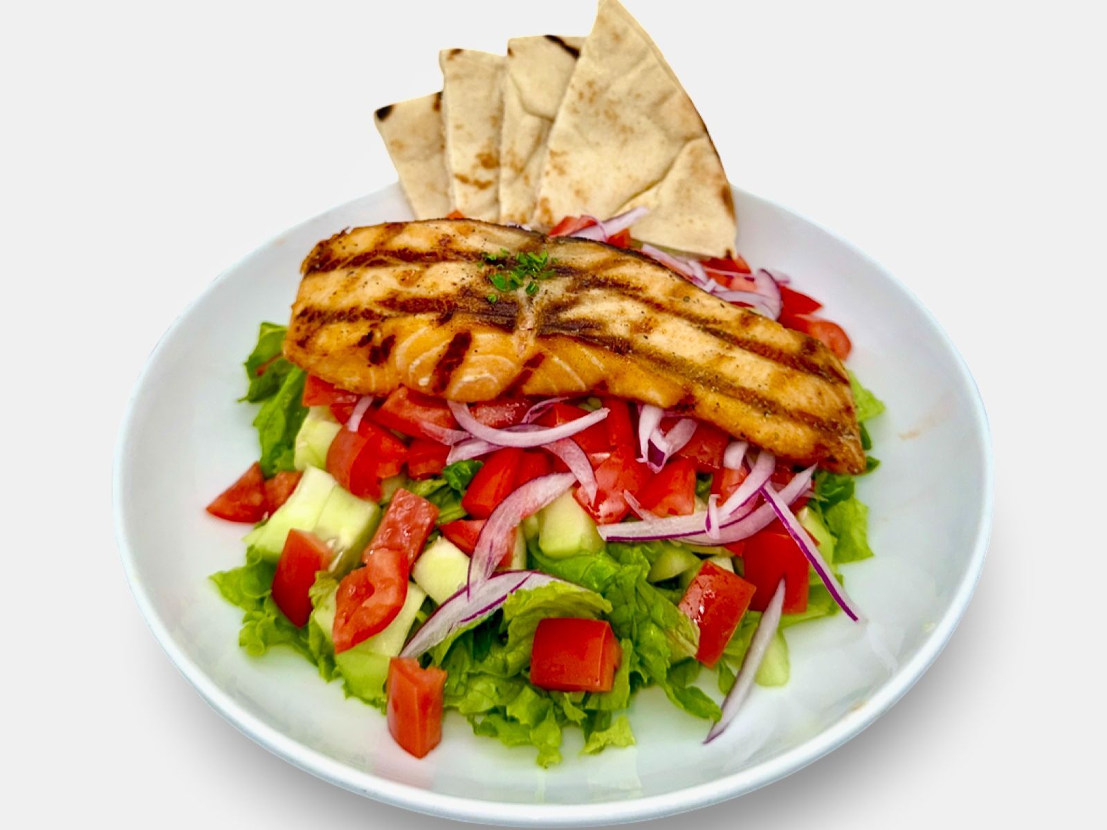 Fresh green salad with lettuce, tomato, cucumber, and onion, topped with freshly grilled charbroiled wild salmon. Served with warm pita bread, dressing, and sauce on the side.