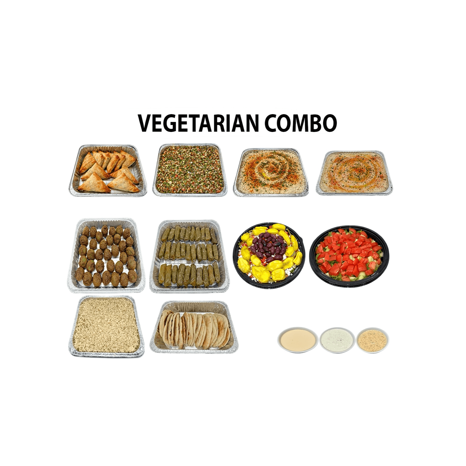 A delicious vegetarian feast featuring spinach pie, falafel, dolma, creamy hummus, fresh Greek salad, warm pita bread, and your choice of rice, brown rice, or fries.