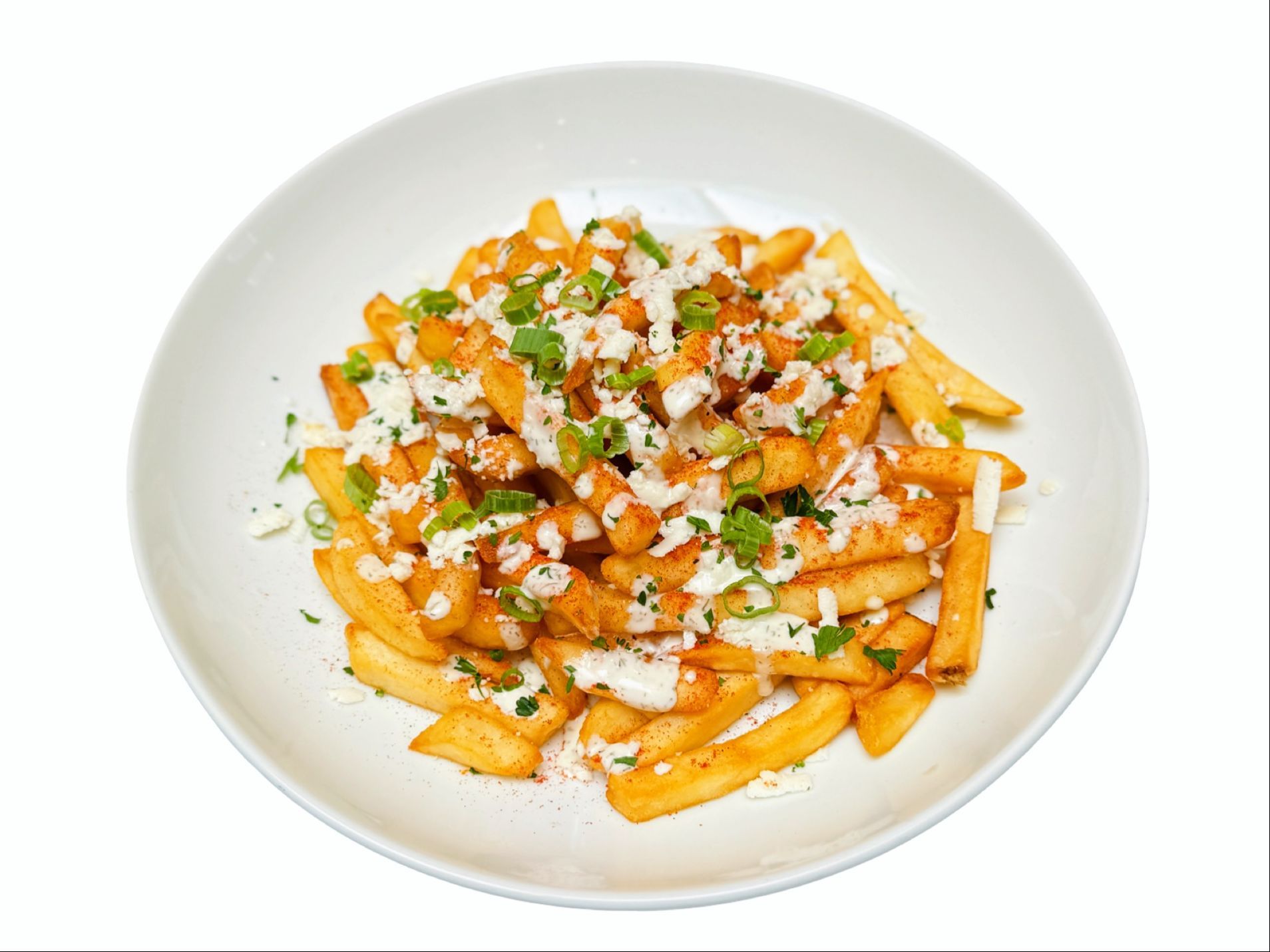 Greek season fries. Serves with our special white sauce, feta cheese and green onion.