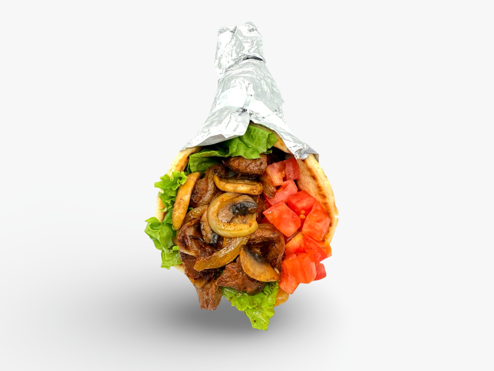 Tender marinated steak with grilled onions and mushrooms, wrapped in a warm pita with crisp lettuce and fresh tomato for a hearty, flavorful bite.