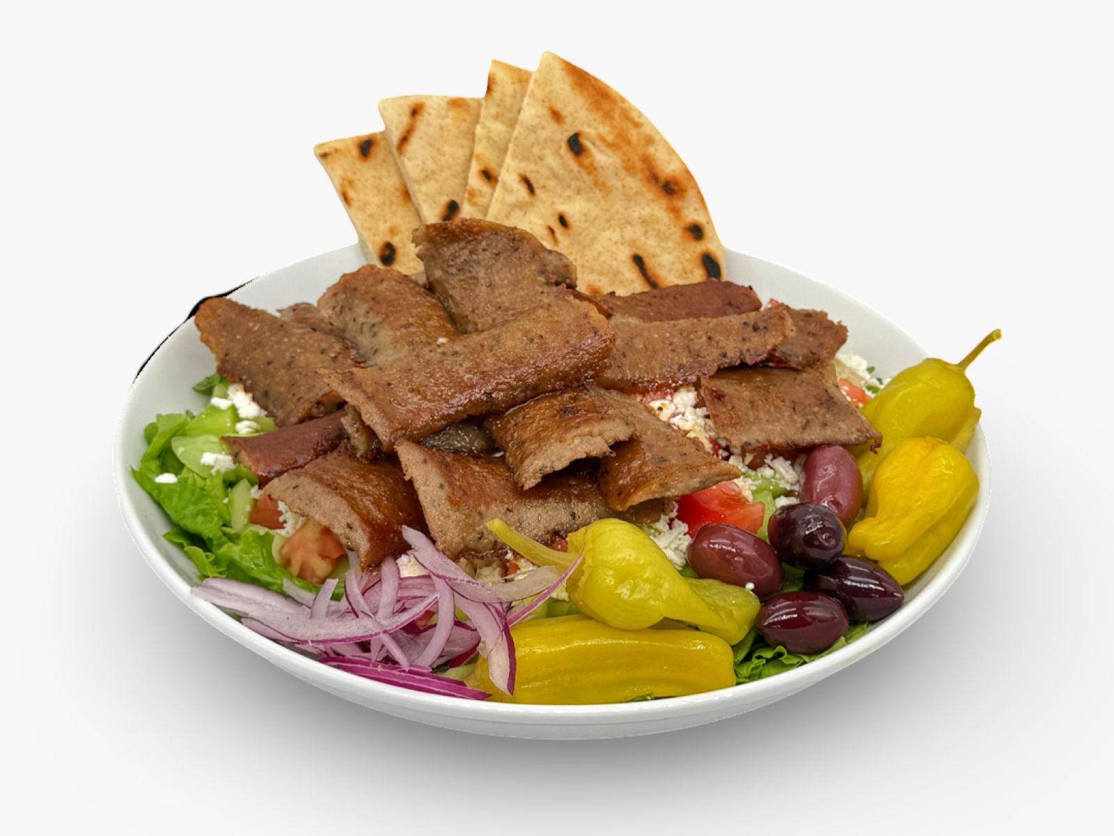 Tender sliced gyros served over fresh lettuce, tomato, and cucumber, topped with feta cheese, olives, and pepperoncini. Served with tzatziki sauce, our house dressing on the side, and warm pita bread.