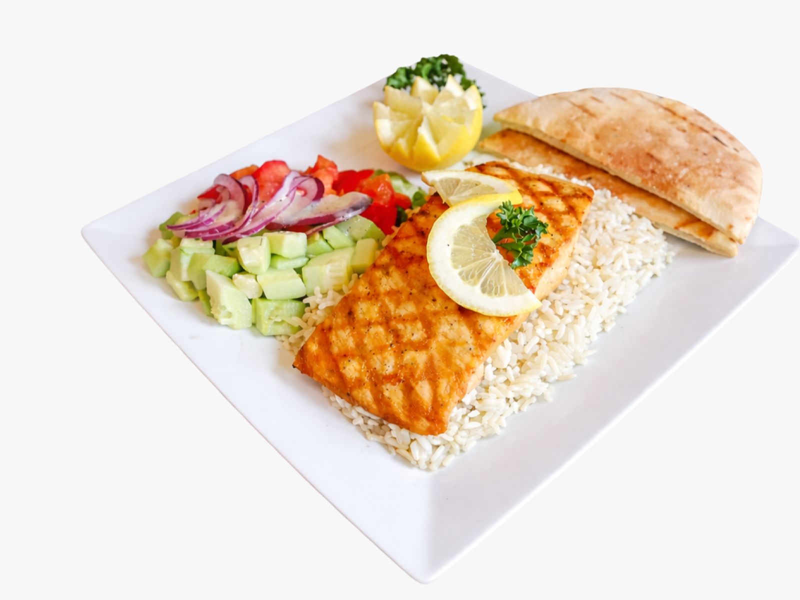 Charbroiled wild salmon grilled to perfection, served with warm pita bread, fresh salad, and your choice of rice, brown rice, or fries.