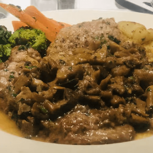 Chicken breast sauteed with mushrooms and marsala wine, with a side of sauteed vegetables and roasted potatoes