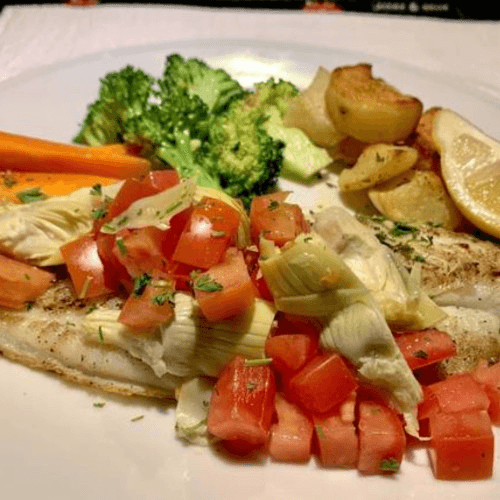 Filet of Sole Grilled and topped with fresh chopped tomatoes, artichokes, olive oil and garlic