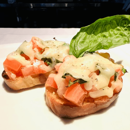 Vegetarian. Toasted bread with fresh tomatoes, basil, garlic and extra virgin olive oil