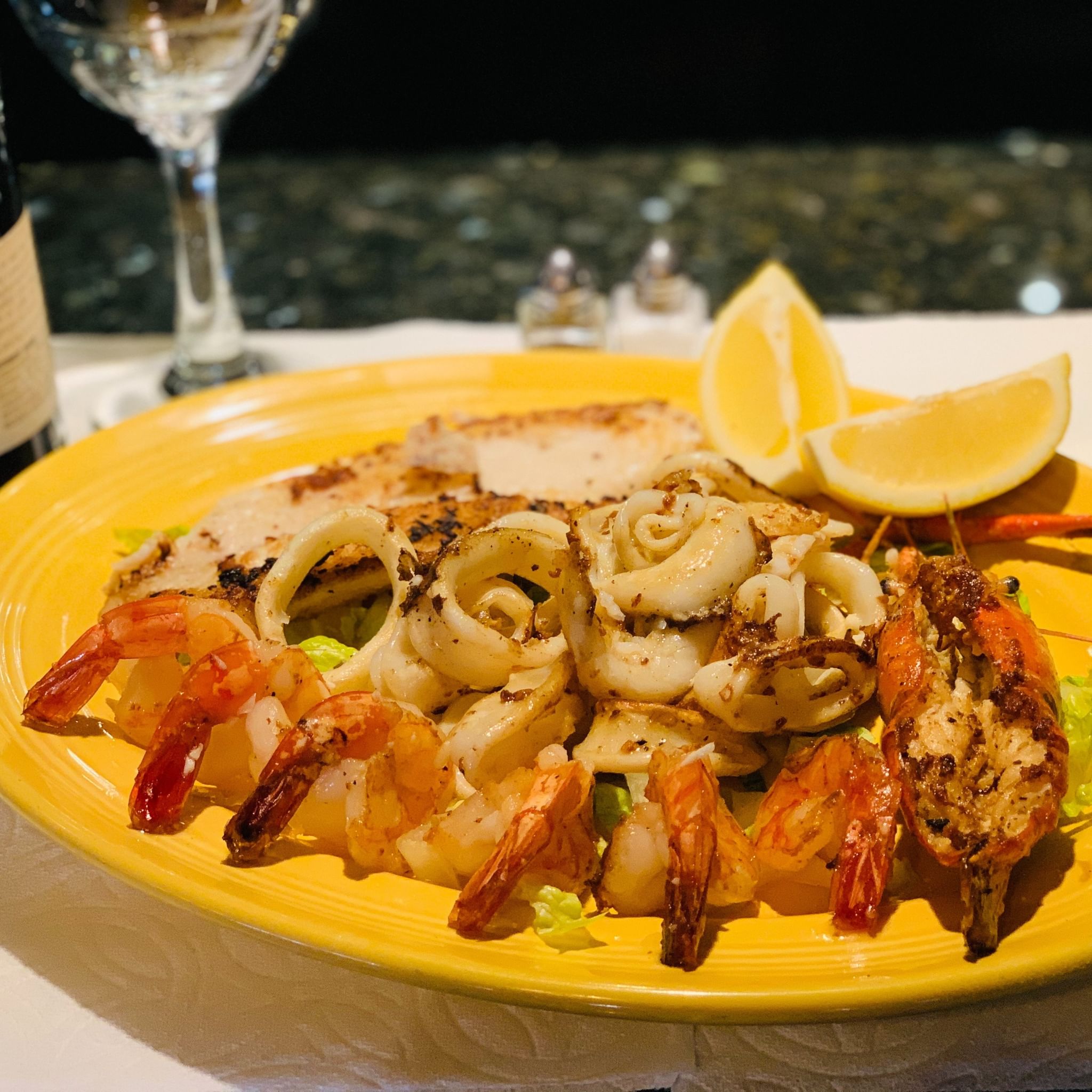 Grilled fish of the day, shrimp, calamari and a jumbo prawns marinated in olive oil and herbs served on a bed of mixed greens