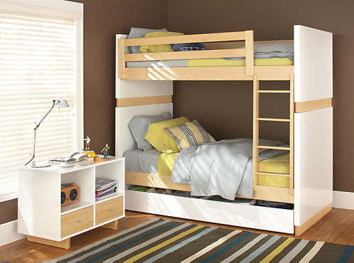 The Moda kids' bunk bed offers simple, functional design with a lacquer finish that keeps each bed looking great from toddler to teen years. Made from solid maple and white medium density fiberboard, the guard rail and ladder are included. This bed features a mattress platform made of wood slats, eliminating the need for a box spring or foundation. For bunk bed safety, we recommend a 6-inch thick mattress for the upper and lower bunk. Shop our kids' mattresses for a perfect fit.