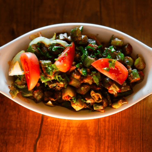 Sautéed slices of okra and tomatoes sautéed in garlic, cilantro and Himalayan spices. Vegan.