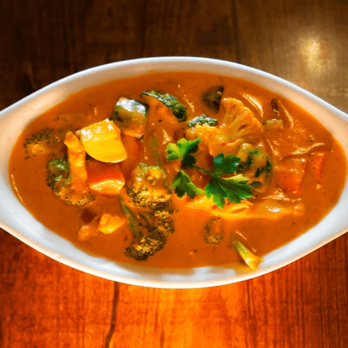 A generous bowl of fresh vegetables simmered with tomatoes and mountain-grown spices in a hearty and healthy broth. Served with noodles. Vegan available.