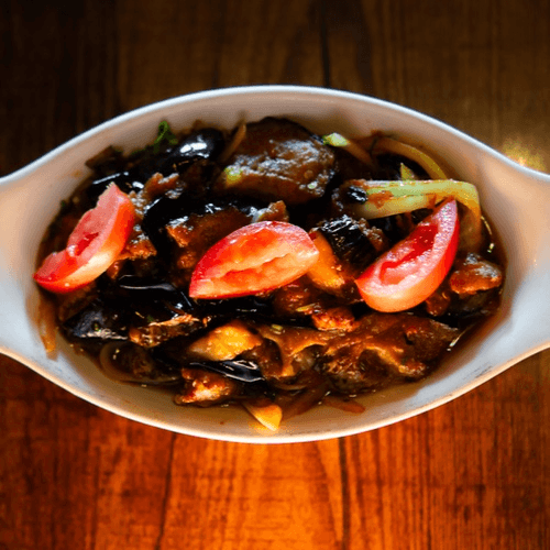 Fresh sliced eggplant sauteed with ginger, garlic, and fresh tomatoes.