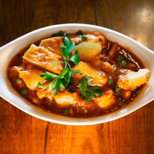 Boneless chicken curry with potatoes, onions, tomatoes, herbs and spices.